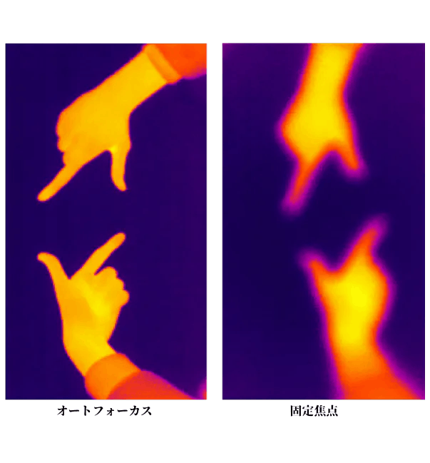 Mobirシリーズの赤外線カメラは256×192pixel(Airは120×90pixel)の高解像度で表示されます。さらにオートフォーカス機能も搭載しているので、サーモグラフィで映し出された対象の輪郭もくっきり。何を映し出しているのかもハッキリ分かります。