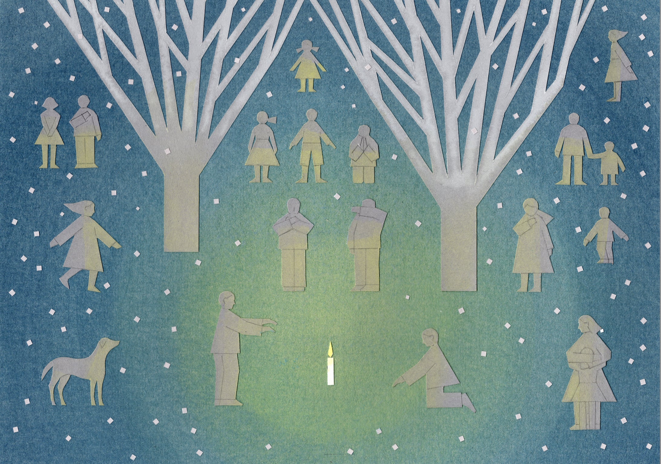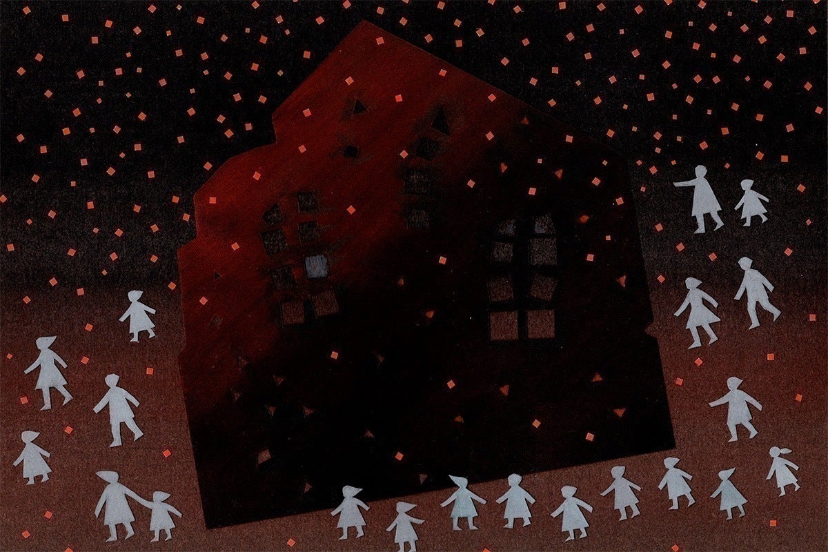 そして絵は同年夏にほぼ完成し、11月にひだまり舎の中村真純さんのお目に留まった次第です。本文はこれまでの訳文を参考にして絵に沿うように書いてみました。その文については翻訳家の高橋文子さんから適切なご指摘をいただいて修正を重ねました。悲しい内容かもしれませんが、最後のページの絵にこめたように、死と憎しみが日々の空気を侵食してゆくなかで、わたしたちは「記憶」とともに希望や憧れを語り続けなければならないと考えています。たとえそれが仄かな明かりにすぎなくても。