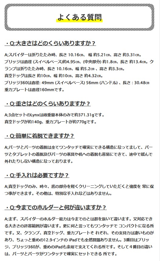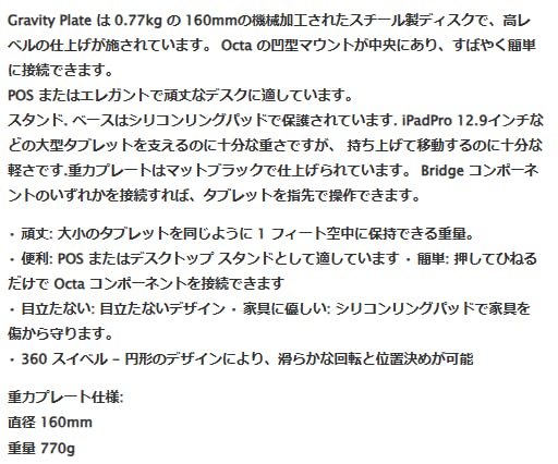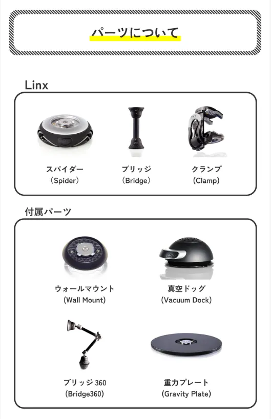 「クランプ」「真空ドッグ」「ウォールマウント」「重力プレー ト」が、がっちりと、根元を固定し、ぐらつかせない。