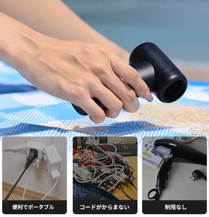 Anymotor には 3 つのノズル、内蔵バッテリー、充電ケーブルが付属しており、いつでも手軽にご使用いただけます。 Anymotor 一つで、旅行や各種アクティビティがより楽しくなる他、必要なものが少なくなるので生活をシンプルにできます。