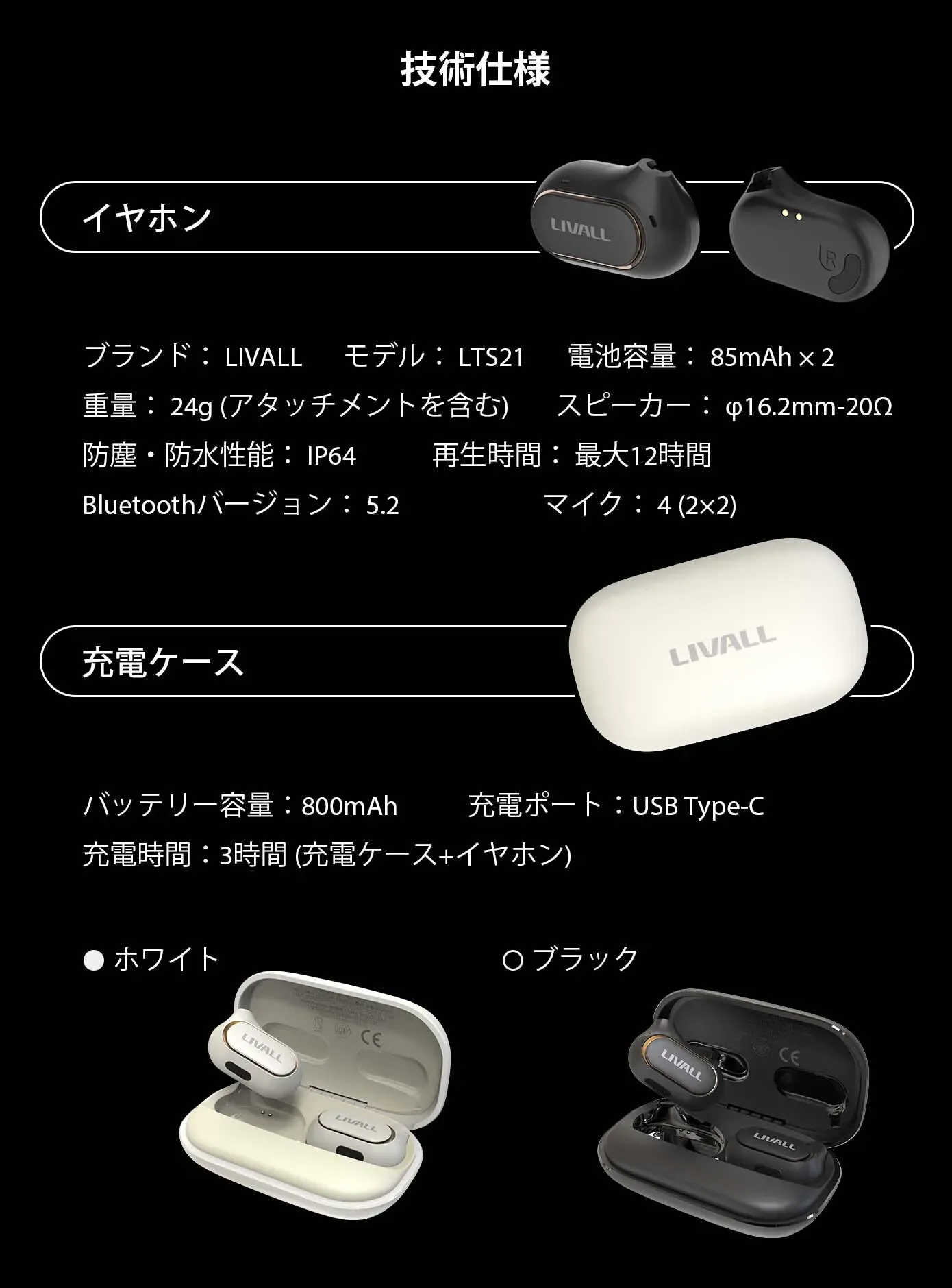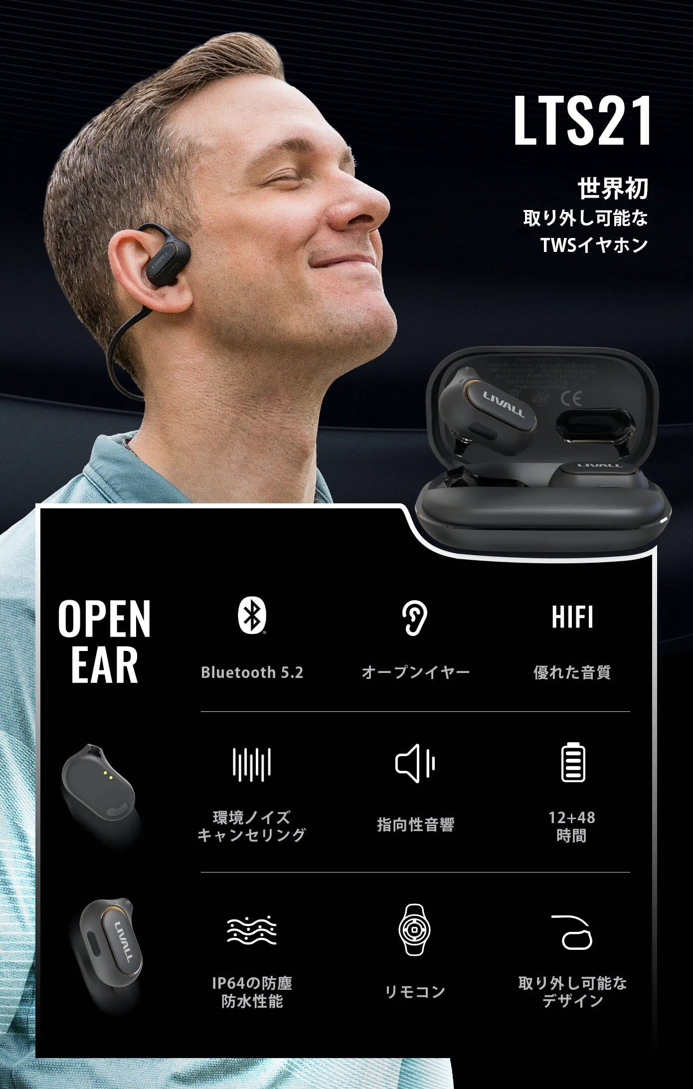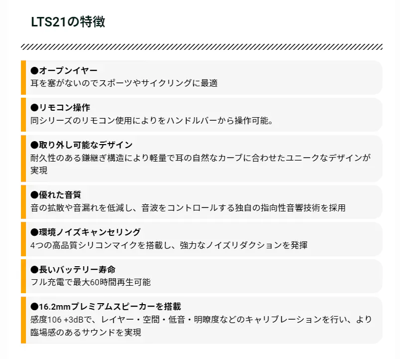 また、耳の自然なカーブに合わせたユニークなデザインは、LTS21がヘッドマウント型オープンイヤーTWSヘッドホンの中で最も軽量と呼ぶにふさわしいものです。