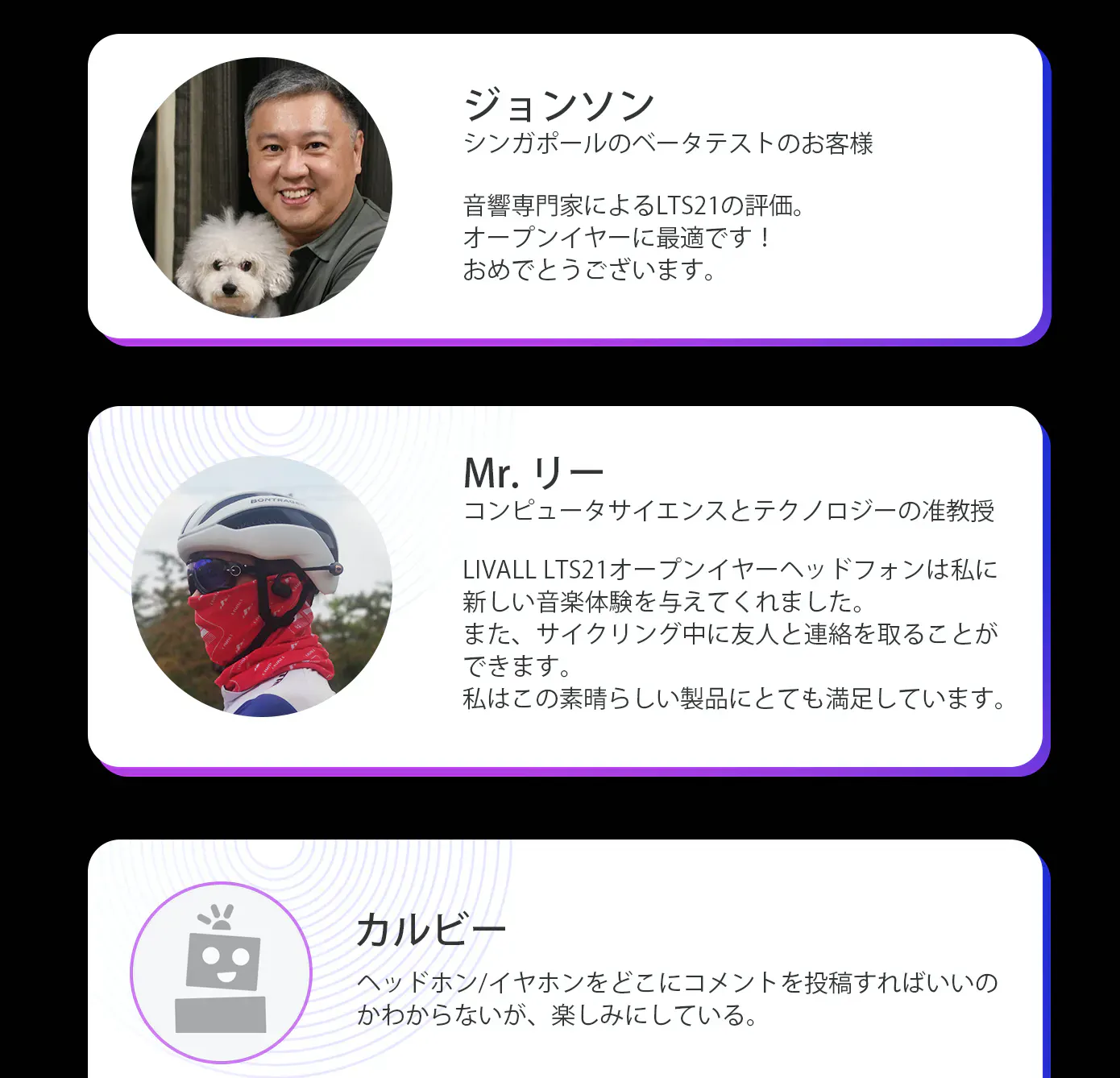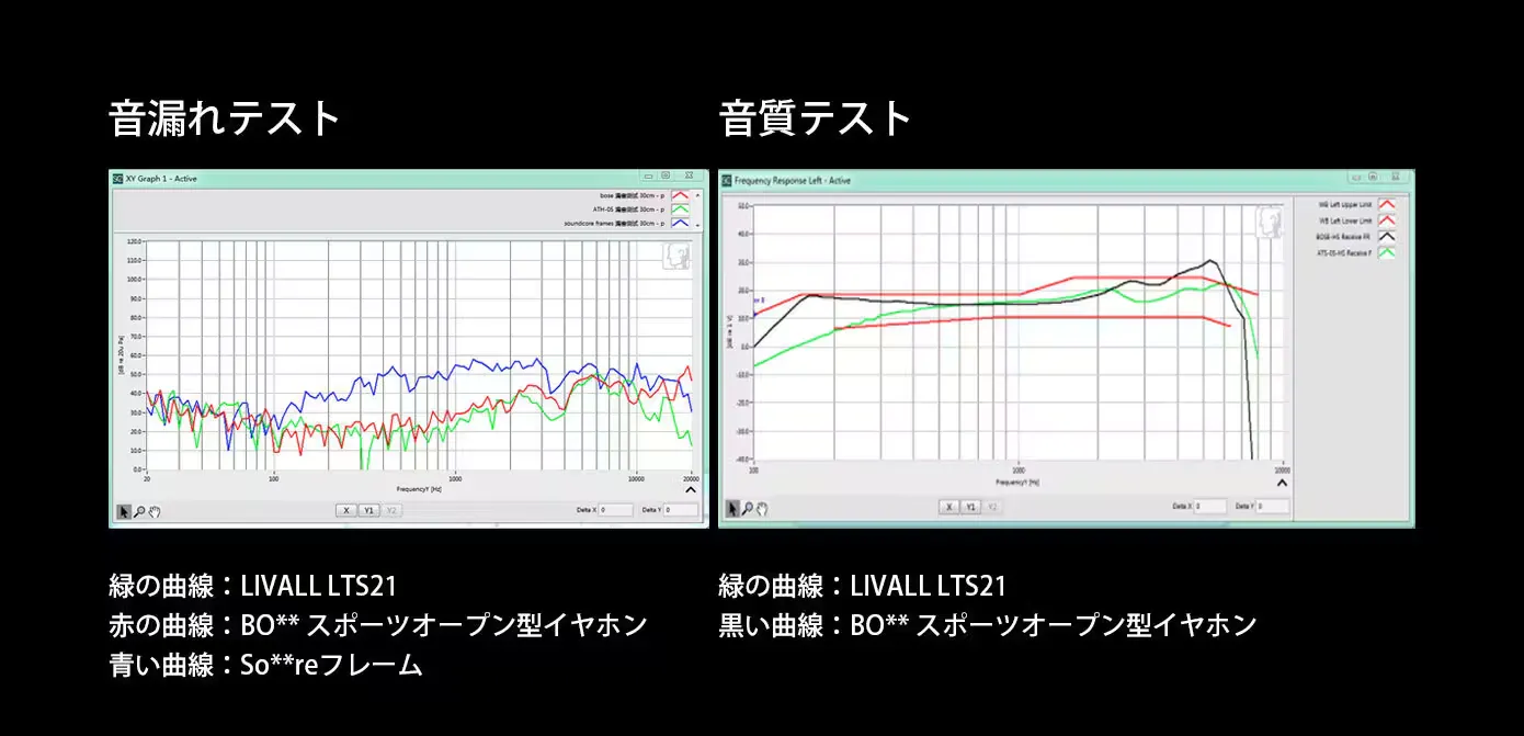 1. LIVALL LTS21の全体的な音質は、競合製品より優れている。2. 競合製品BO**スポーツオープン型イヤホンの音声品質と明瞭度は、LIVALL LTS21より少し優れている。3. 周囲の騒音の大きさでLIVALL LTS21は、BO** スポーツオープン型イヤホンより優れている。4.LIVALL LTS21の音漏れ防止は、競合する2つの製品よりも優れている。