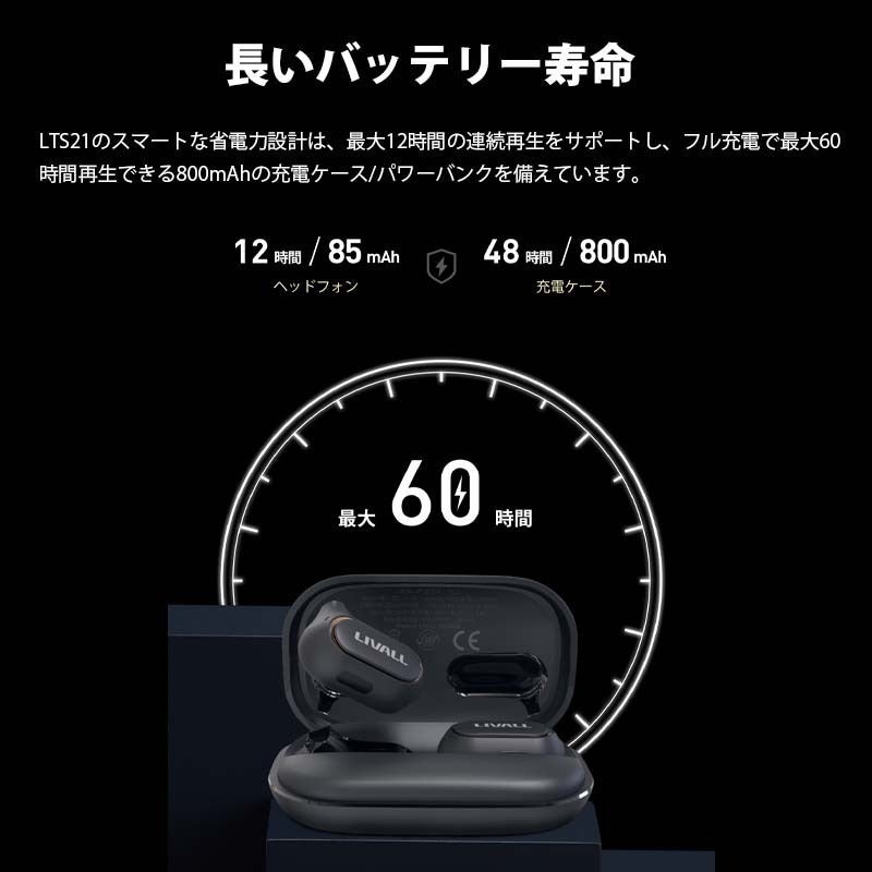 LTS21のスマートな省電力設計は、最大12時間の連続再生をサポートし、フル充電で最大60時間再生できる800mAhの充電ケース/パワーバンクを備えています。