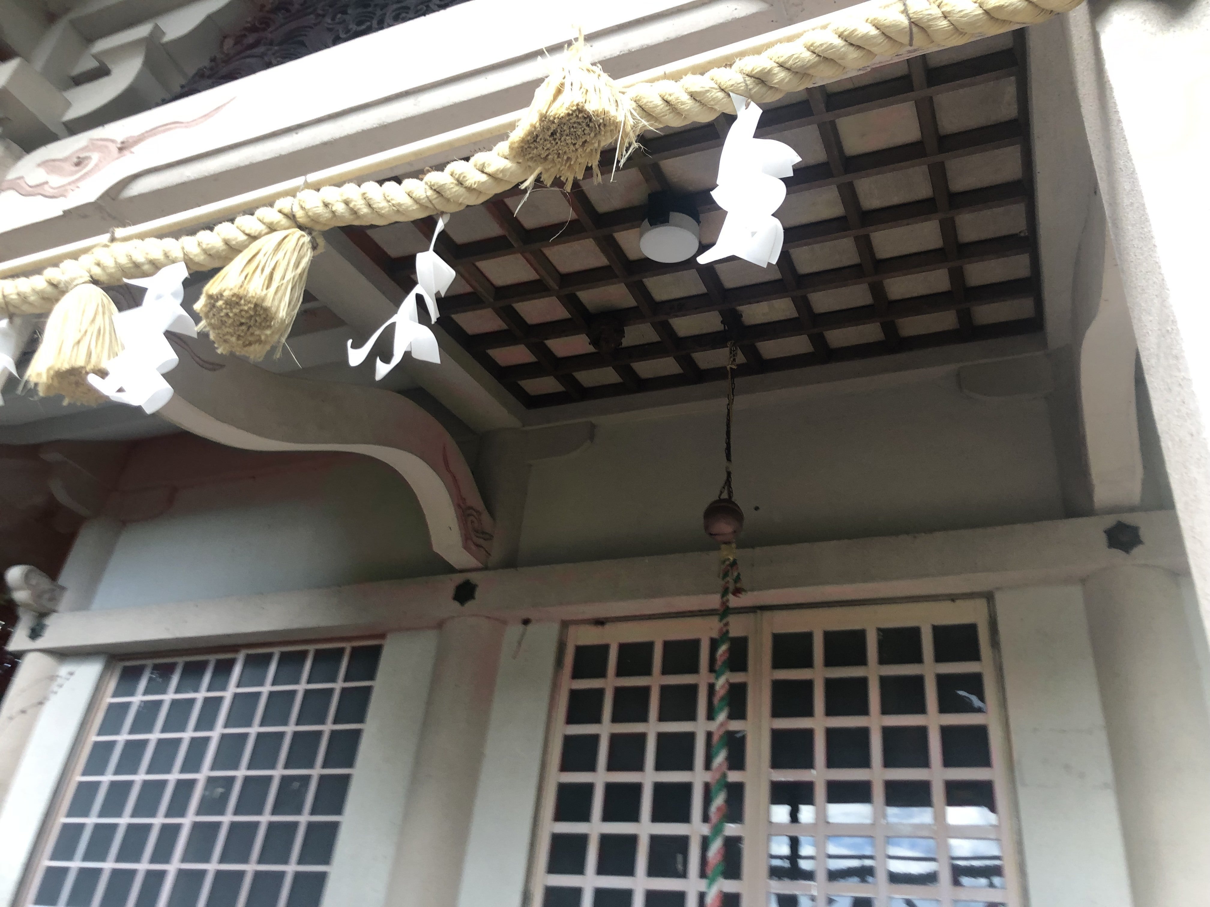 音がするので見上げてみたら、なんと御本殿の天井にスズメバチの巣がありました。