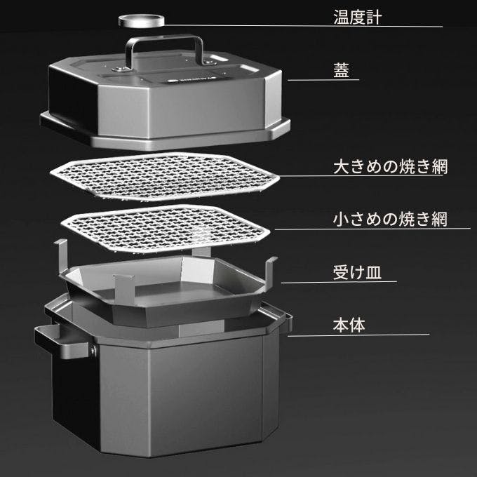 本体には網 大小1枚ずつ、温度計も付いております。ご自宅とアウトドア用に2台購入もおすすめです!