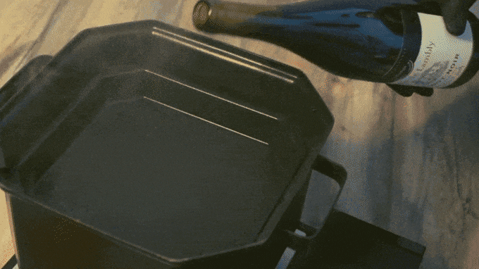 ウォータースモークでスペアリブを仕上げるには、受け皿にワインを入れて使うことで煙+蒸気による最高の香りづけができます。