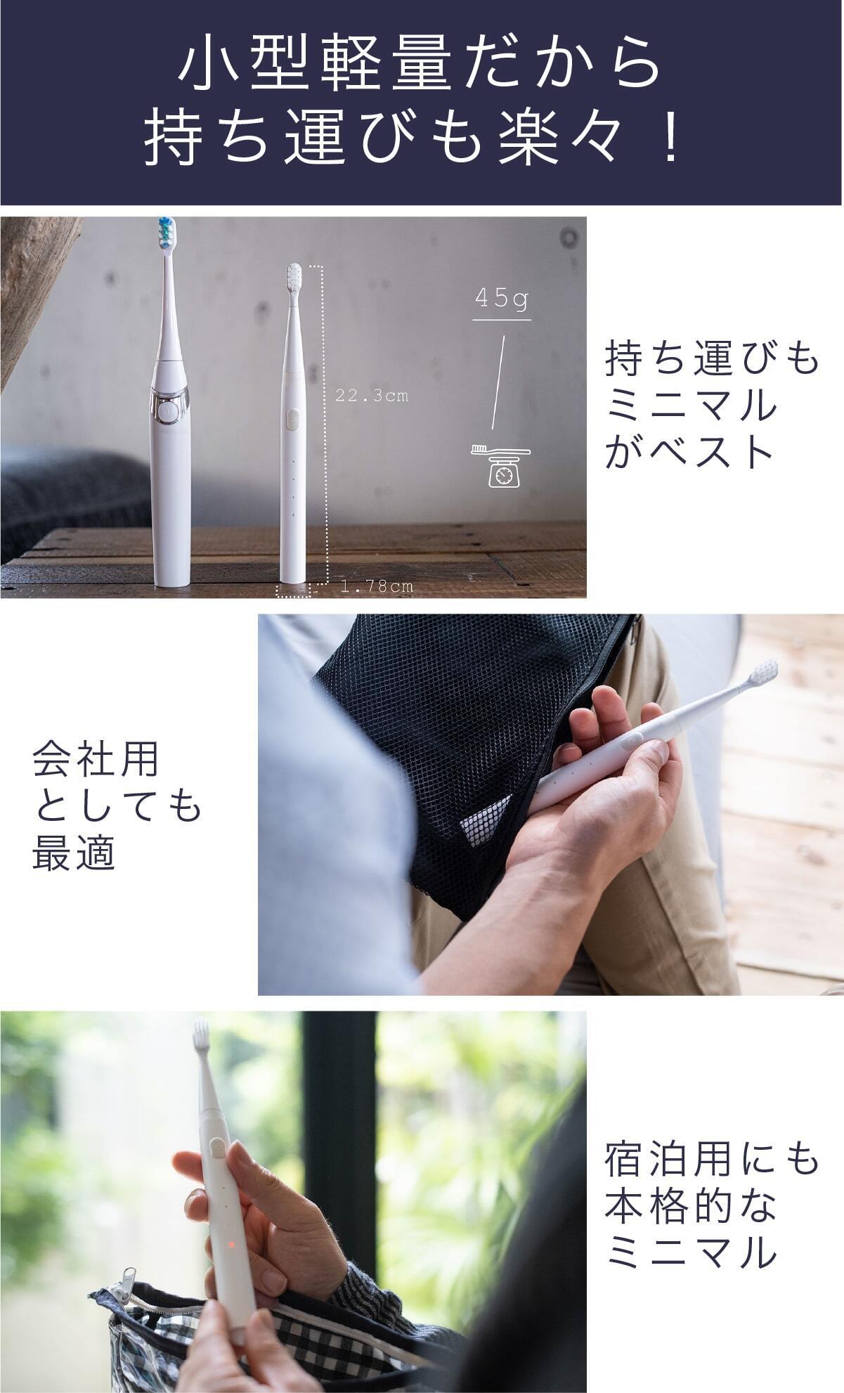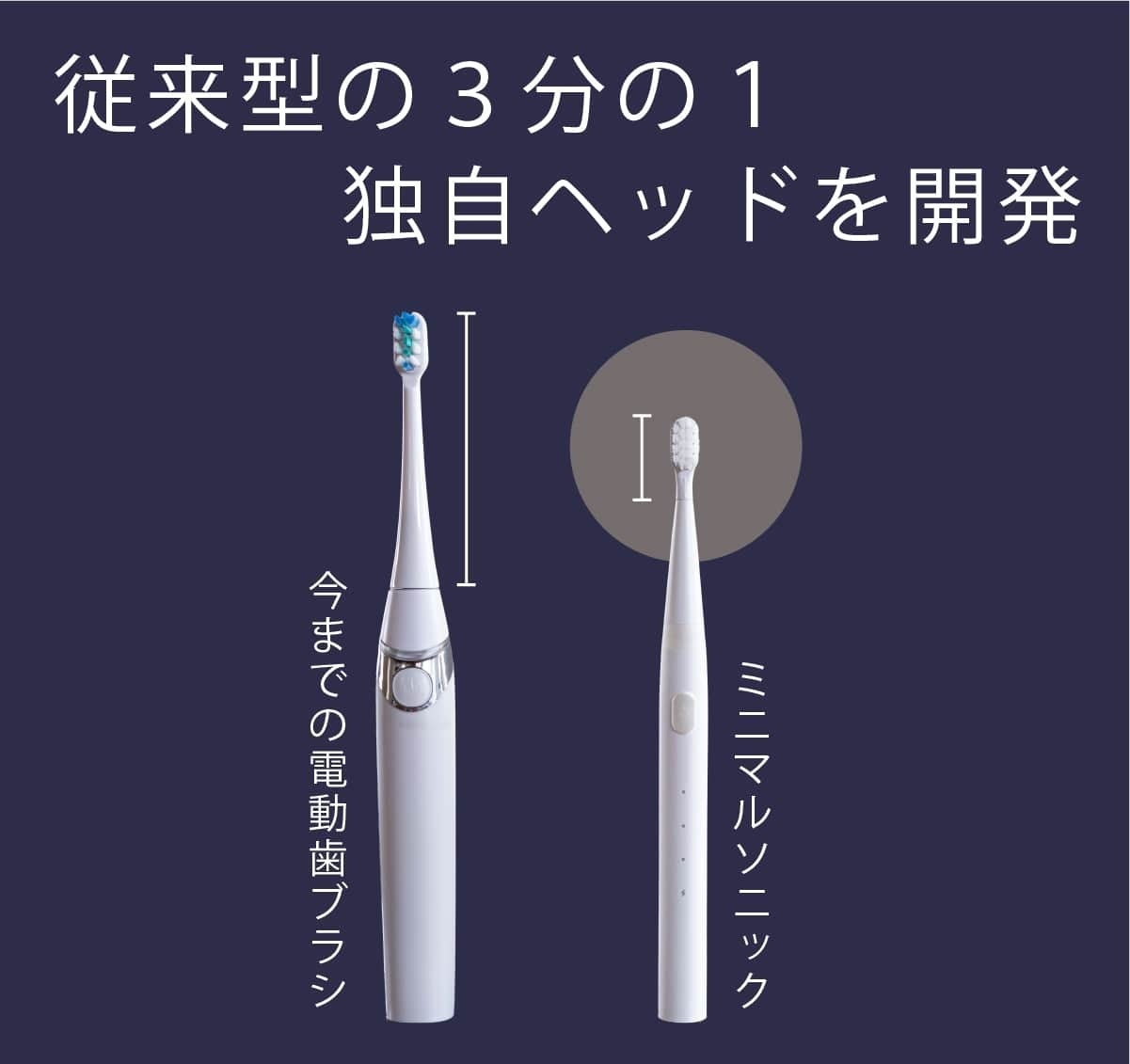 今までの電動歯ブラシを大きいと感じたことはありませんか?普通の歯ブラシから電動歯ブラシに変えた時にそれを大きく感じると思います。電動歯ブラシは構造上、大型化してしまうのですが、常識に囚われずまったく新しい電動歯ブラシを設計したのがこのミニマルソニックです。画期的な構造で小型でパワフル。未来の体験をはじめましょう。