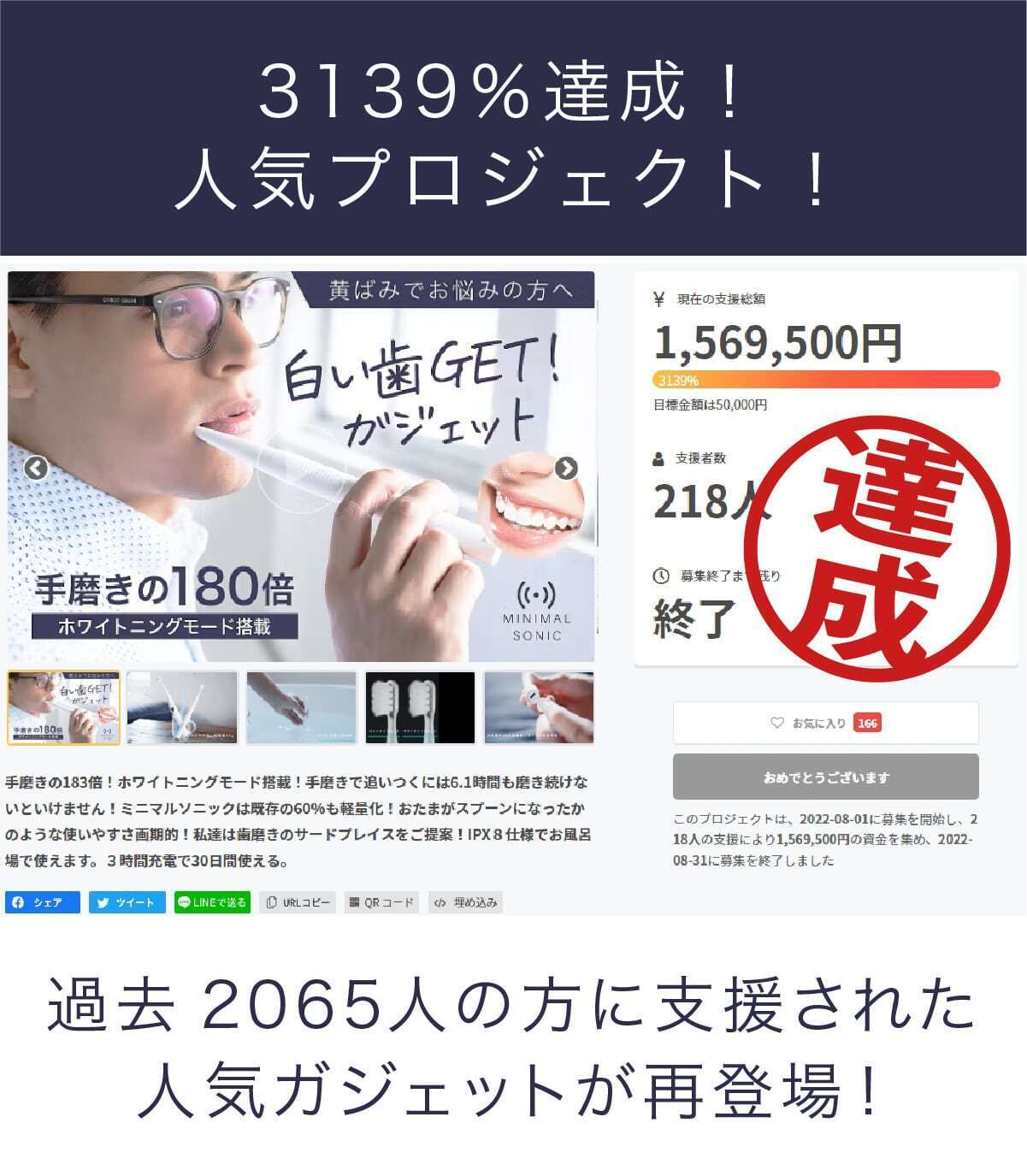 ミニマルソニックは過去2,065人の方に支援され3,139%を達成した大人気のプロジェクトです。