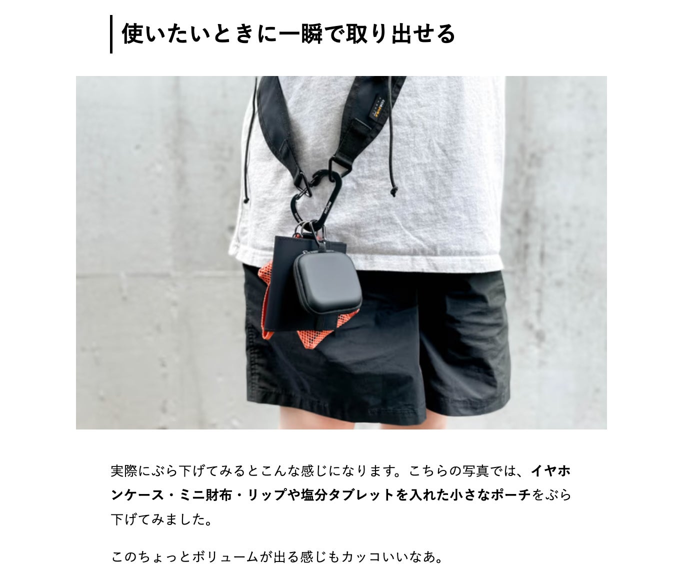 実際にガジェットや財布などを下げていただき、使用感を含めてご紹介くださっています。