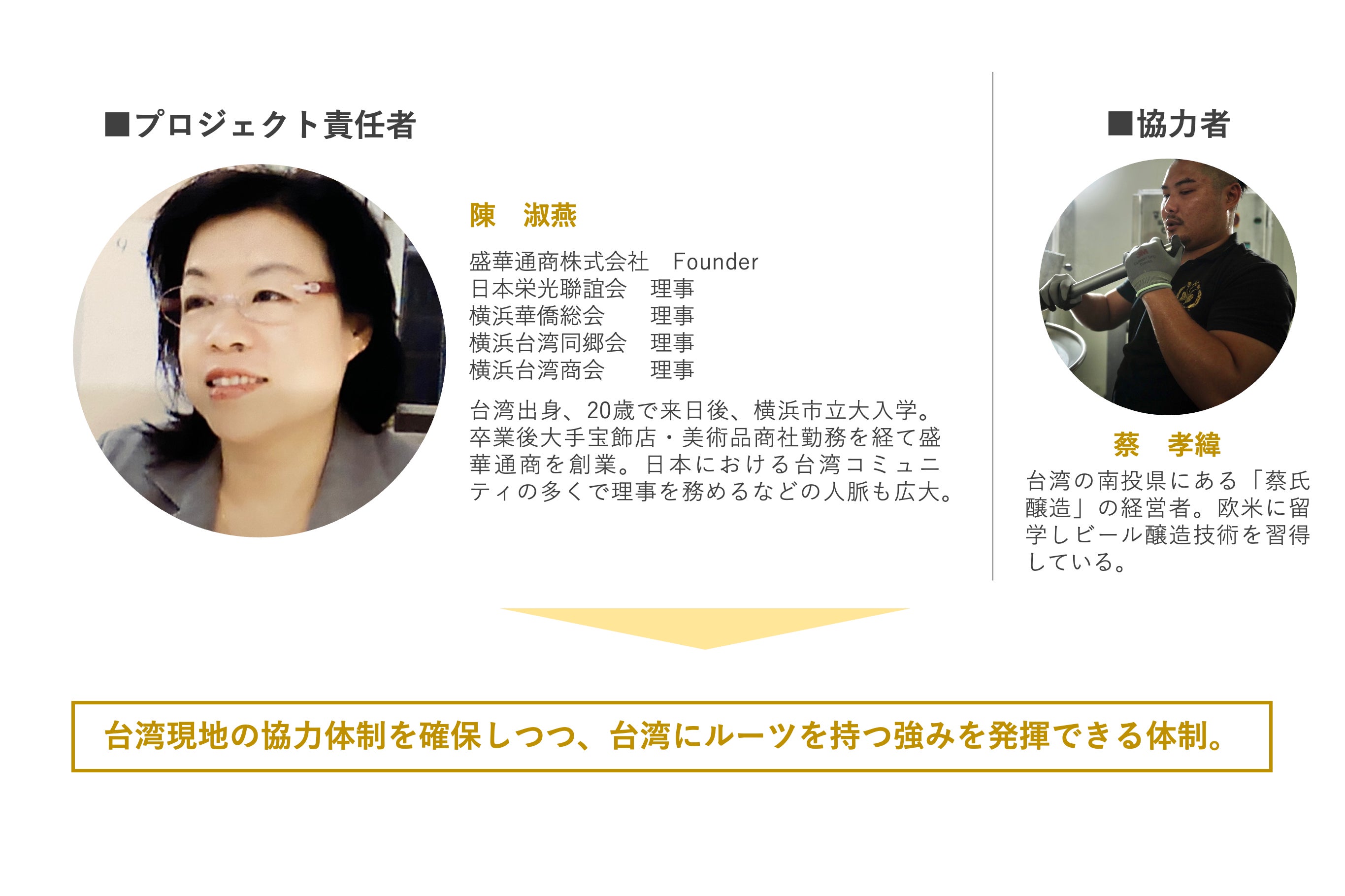 盛華通商株式会社は、20歳の時に来日した台湾人である陳淑燕によって創業されました。1990年当時は今よりもずっと情報の取得が難しく、陳はカタコトの日本語で創業を行い、現在では様々な日本における台湾コミュニティの理事を務めています。そして創業以降、私たちは台湾にルーツを持つ事業会社として、日本と台湾のために何かできないか、ということを常に自問してきました。そして今回「日本と台湾の友好を担うこと」という明確なミッションに向けて本プロジェクトをスタートさせました。台湾現地に、ブルワリー・ビアバー経営者の蔡氏を招き、適宜コンサルティングを受けられるチーム作りを行っています。