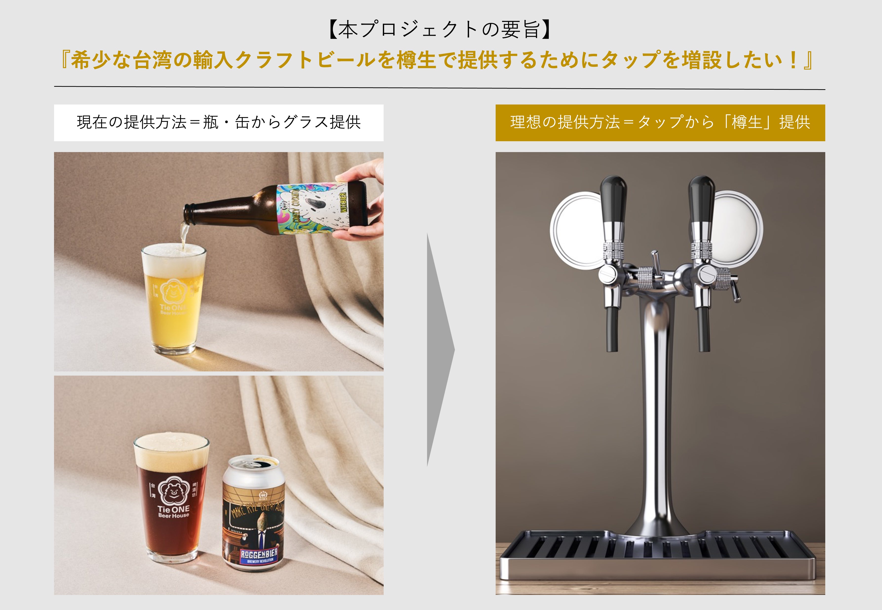 そして本プロジェクトの要旨ですが、皆様に樽生で台湾のクラフトビールをお届けするには、ケグ(樽)だけでは足りず、ケグからビールを抽出するための「タップ」が必要になります。私たちは本プロジェクトを通じて、台湾クラフトビールを繋ぐためのタップの増設を目指します。