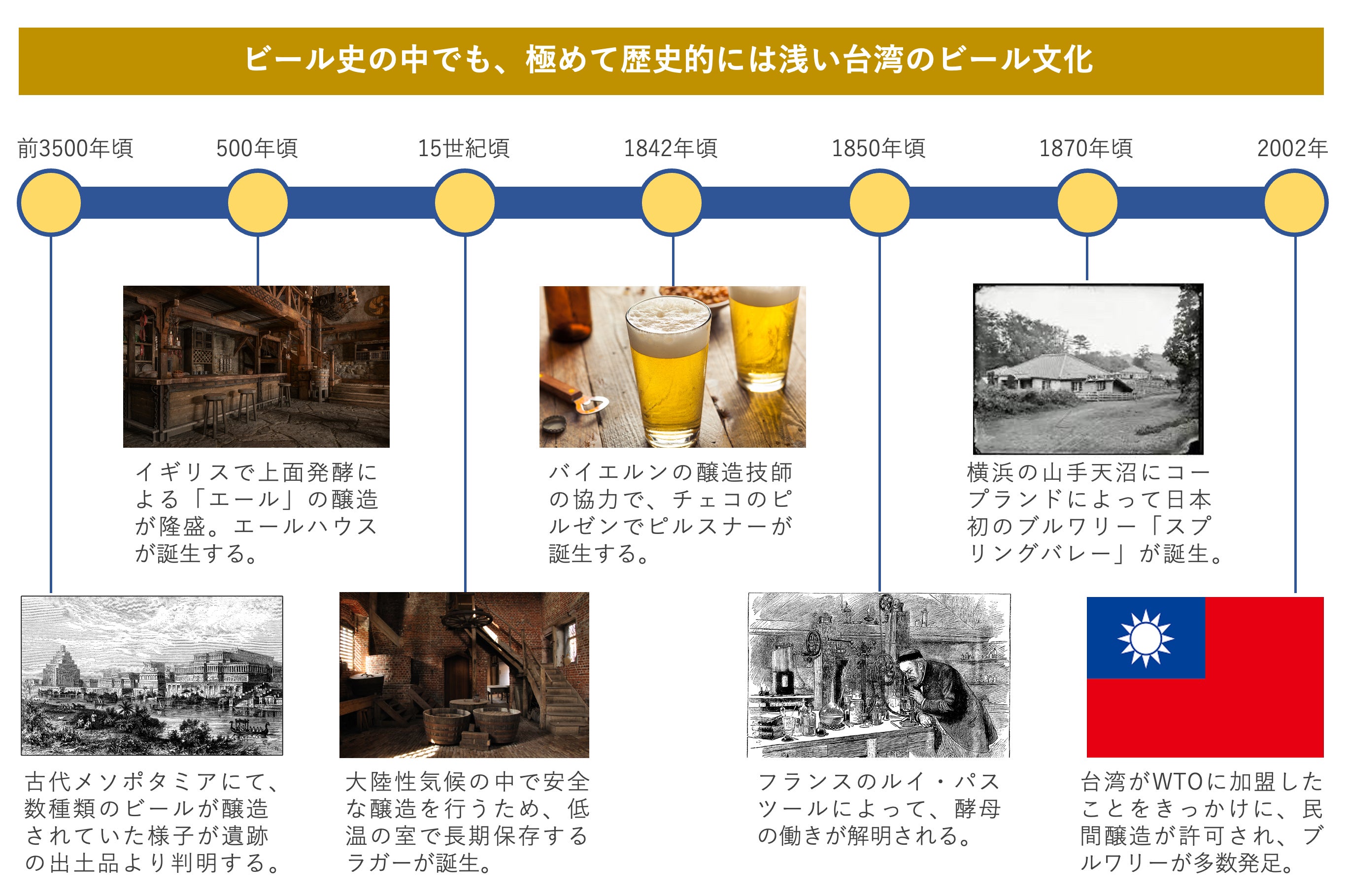 そもそも台湾のクラフトビール産業は、2002年に台湾がWTOに加盟して初めて民間醸造が許可されたという、とても若い産業です。世界のビールの歴史を見ると、ビールの誕生はおおよそ紀元前5000年〜3500年前というのが大体の共通認識です。比較的ビール市場が遅い日本でも初めてブルワリーが誕生したのがおよそ1870年頃なので、日本と比較しても150年程遅れているのです。