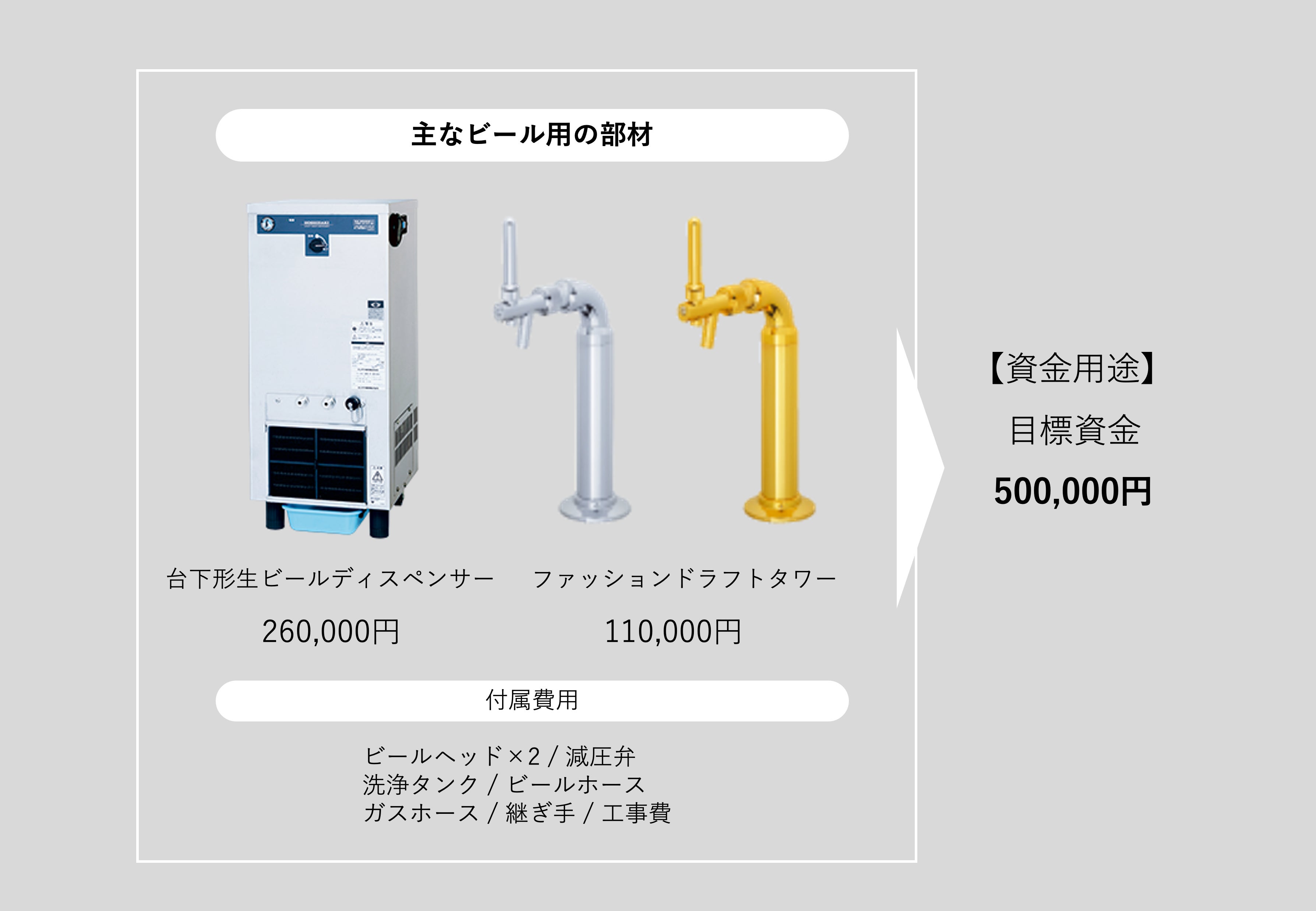 本プロジェクトの資金に関しては、ホシザキ製のドラフトタワー(2本)、及びビール冷却装置(ドラフトタワー2本仕様)、及び付属部材と設置工事費に充当する予定です。目標となる資金額は500,000円を見込んでいます。