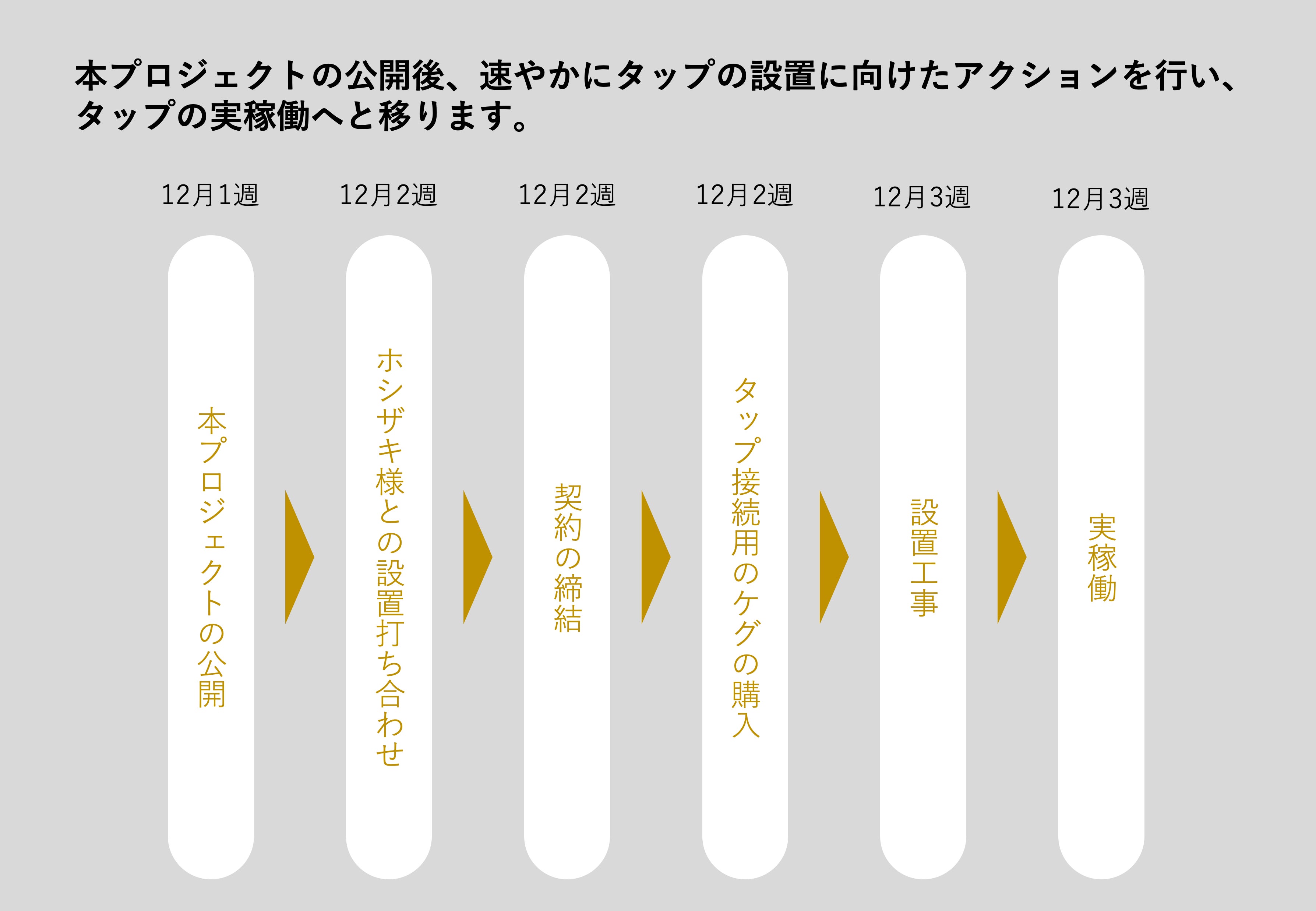 本プロジェクト公開後、設置業者「ホシザキ湘南」へ連絡を取り、具体的な設置工事の打ち合わせに入ります。その後資金を皆様から募集いたしますが、順次設置工事へと取り掛かります。本プロジェクトの資金募集の終了後、皆様からいただいた資金を設置工事費用への支払いに充当いたします。