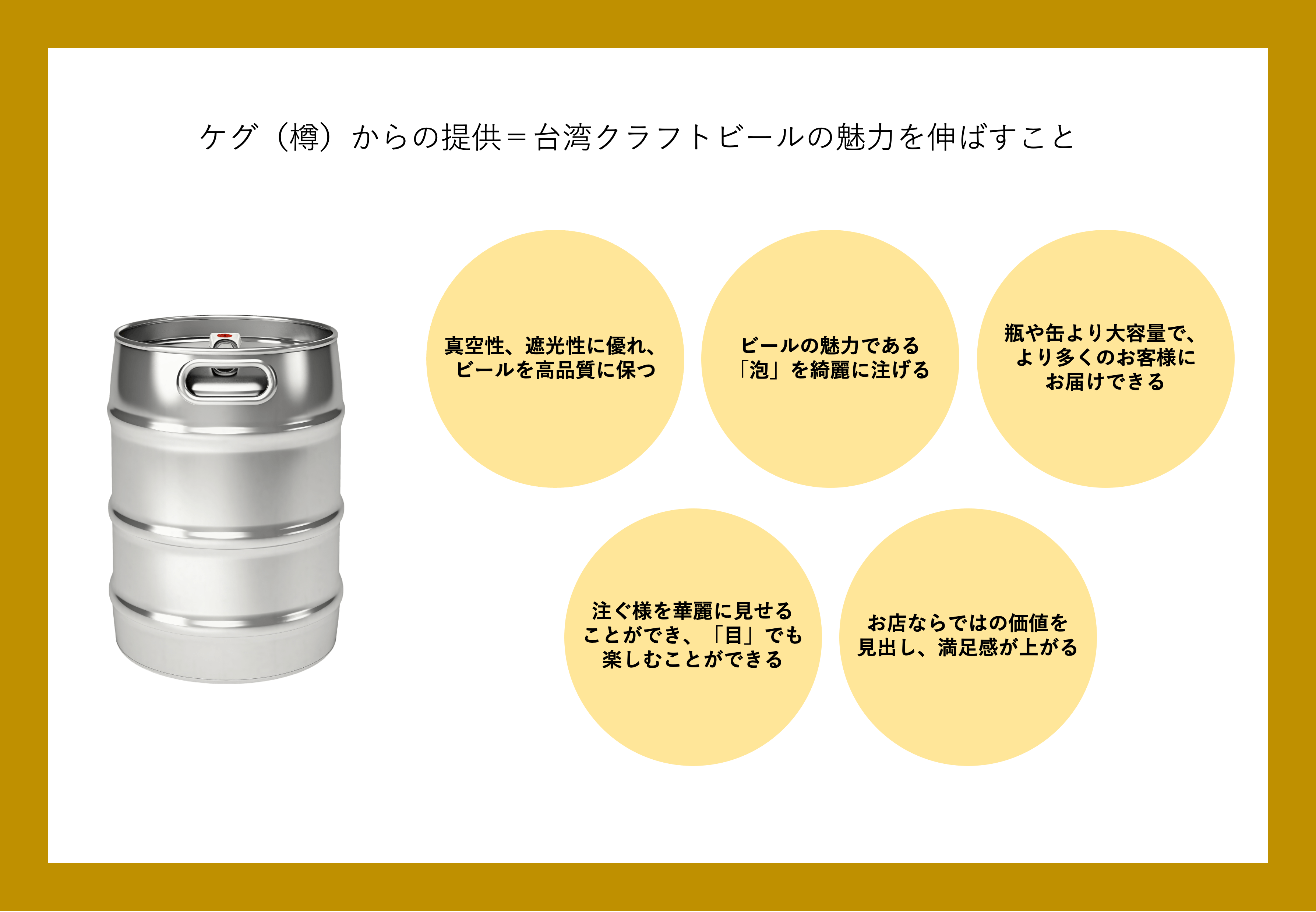 台湾のクラフトビールは歴史がまだまだ浅く、それだけにこれから世界中の方にお飲みいただく時、そこで得られる満足感や驚きはとても大事な要素になってきます。私たちはこの、黎明期とも言える台湾クラフトビールを「樽生」でお出しすることによって、皆様に台湾クラフトビールの魅力を最大限味わって欲しいと考えています。