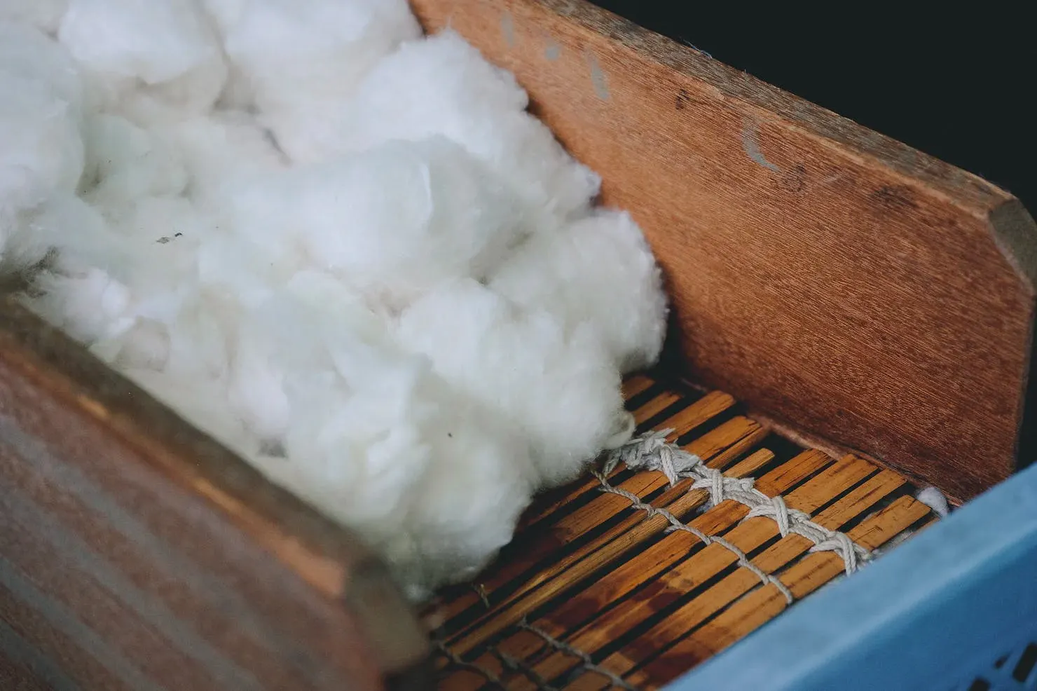 糸の素材には、JOCA認定のコットンを使用。その一部には繊維が短く、一般的な高速紡績機では糸にできなかった落ち綿も含まれますが、低速で稼働するガラ紡により新たに生命が吹き込まれます。