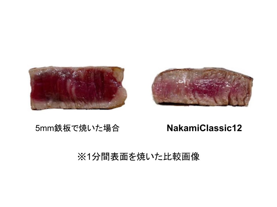 板厚が厚ければ熱源とお肉との間に距離ができるため、加熱部の熱が直接垂直に伝わるだけでなく、水平方向にも伝わってくれます。このため、熱源近くの食材が焼けすぎることを防ぎ、均質な熱伝導によって、肉の旨味を引き出し、ワンランク上の味わいを楽しむことができます。
