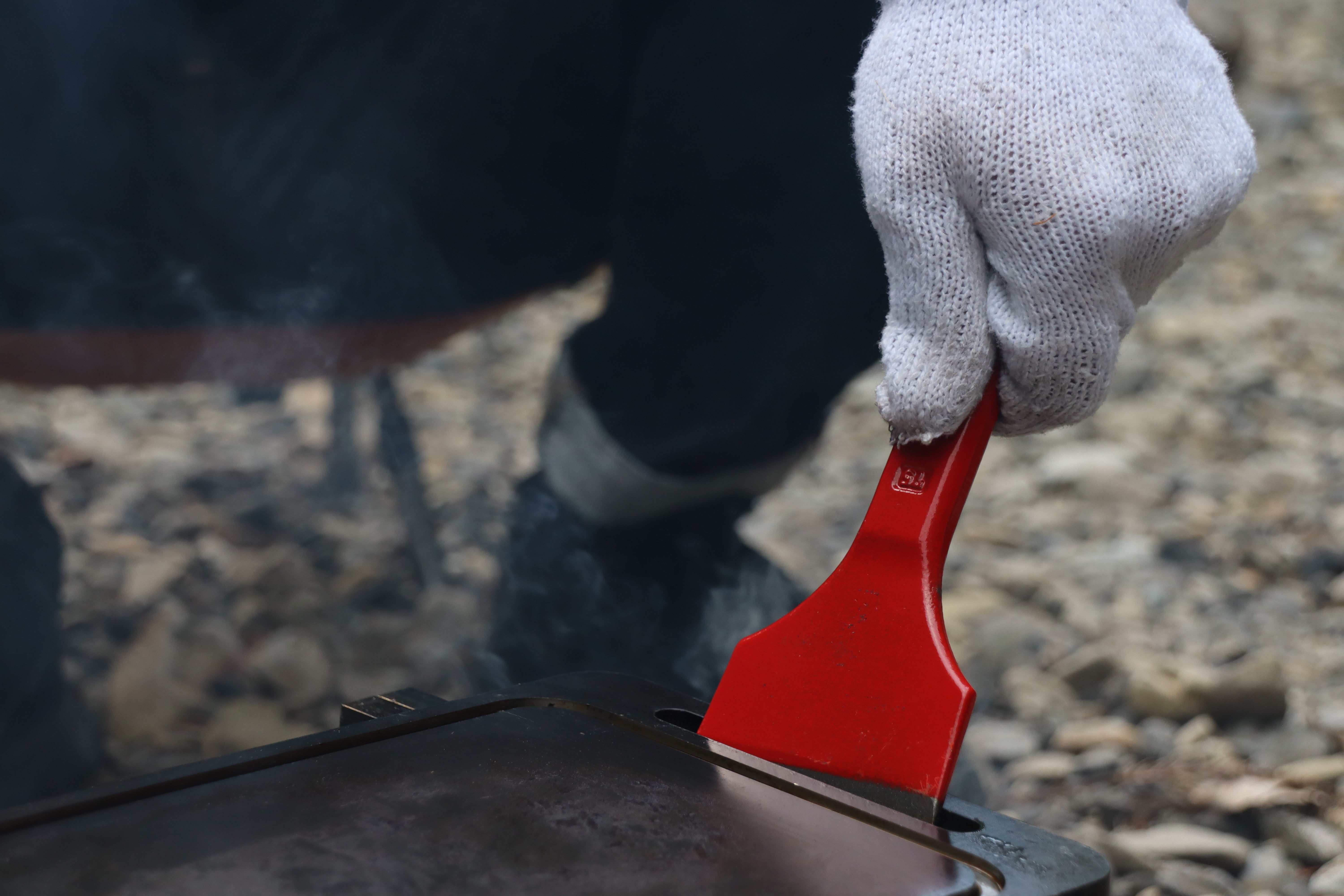 当社が日々の作業で使っている赤ヘラは先端が鉄製のカットチゼル。強くて丈夫で安定感抜群の赤ヘラは極厚鉄板の調理における利便性をぐっと引き上げてくれます。