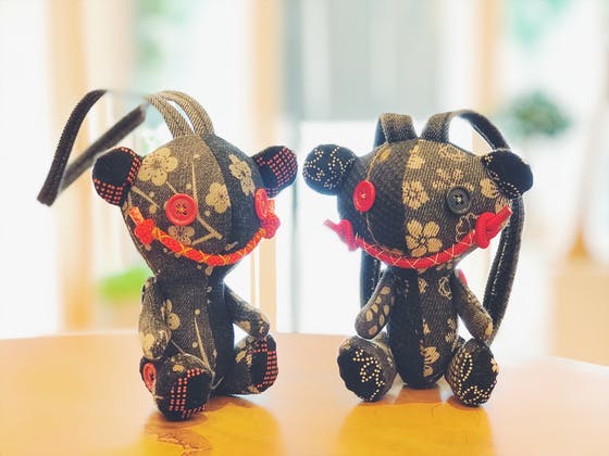 「でにぐま」は、京都デニムのハギレを使ったクマのぬいぐるみ。
