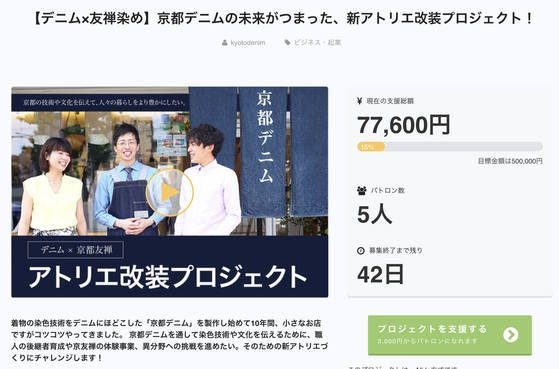 初日からたくさんのご支援ありがとうございます!プロジェクト開始日に、14%のご支援をいただき、スタッフ一同とても感激しております!ご支援ありがとうございます。【TV放映されました!】昨日2018年6月5日放送分 関西テレビで放送の「ちゃちゃ入れマンデー 」#146 やっぱり違う!?不思議の国・京都SPに京都デニムをご紹介いただきました。GYAO!でも見ていただくことができます!(28:00あたりからのご紹介です。)https://gyao.yahoo.co.jp/player/11202/v00014/v0000000000000000589/7月までプロジェクトも続きますので、引き続き応援お願いいたします!