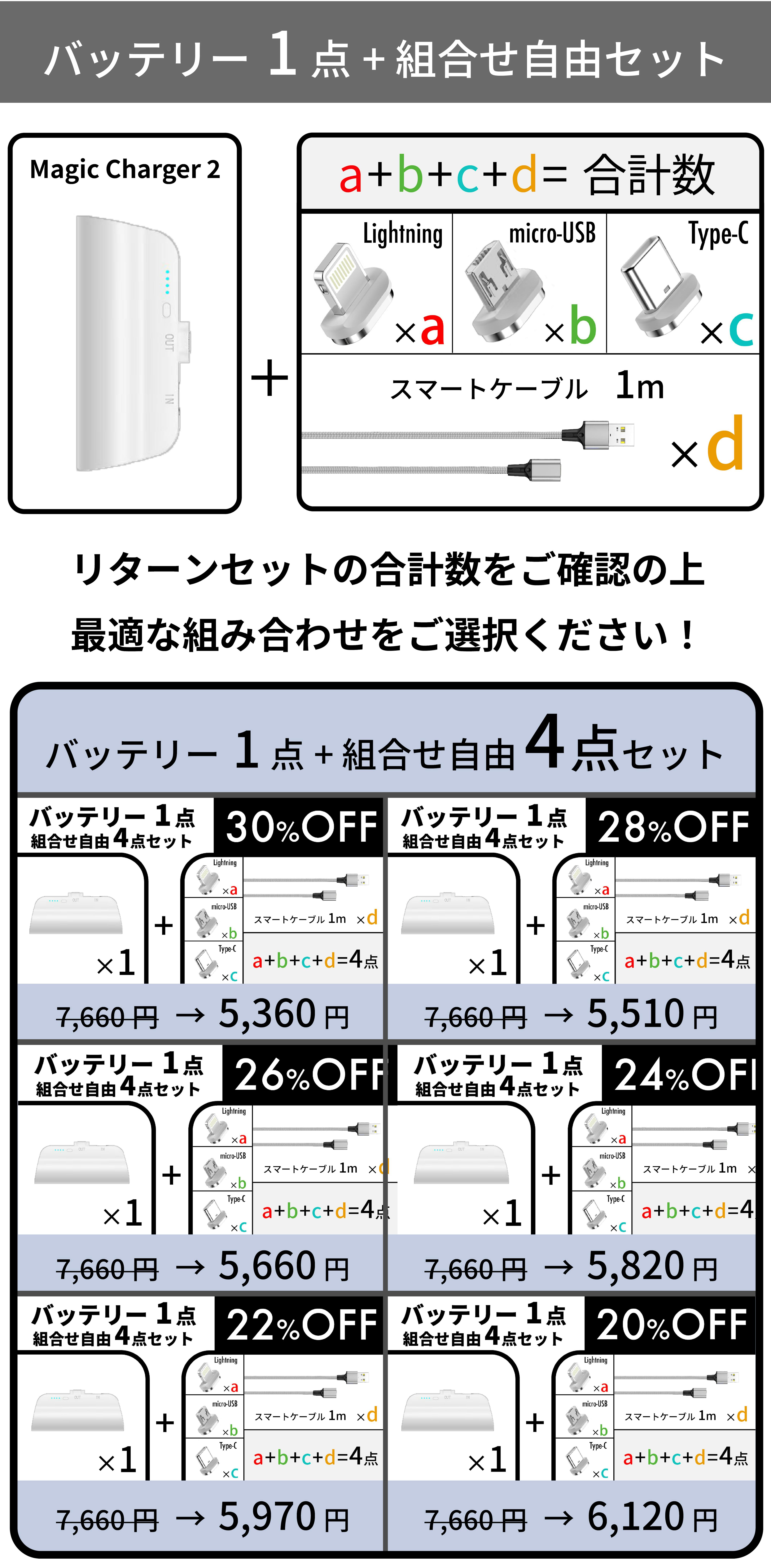 Lightning、Micro-USB、Type-Cのマグネット端子でご使用のあらゆる端末の充電を可能に。これ一台で端子規格の異なる複数端末の充電を可能にします。
