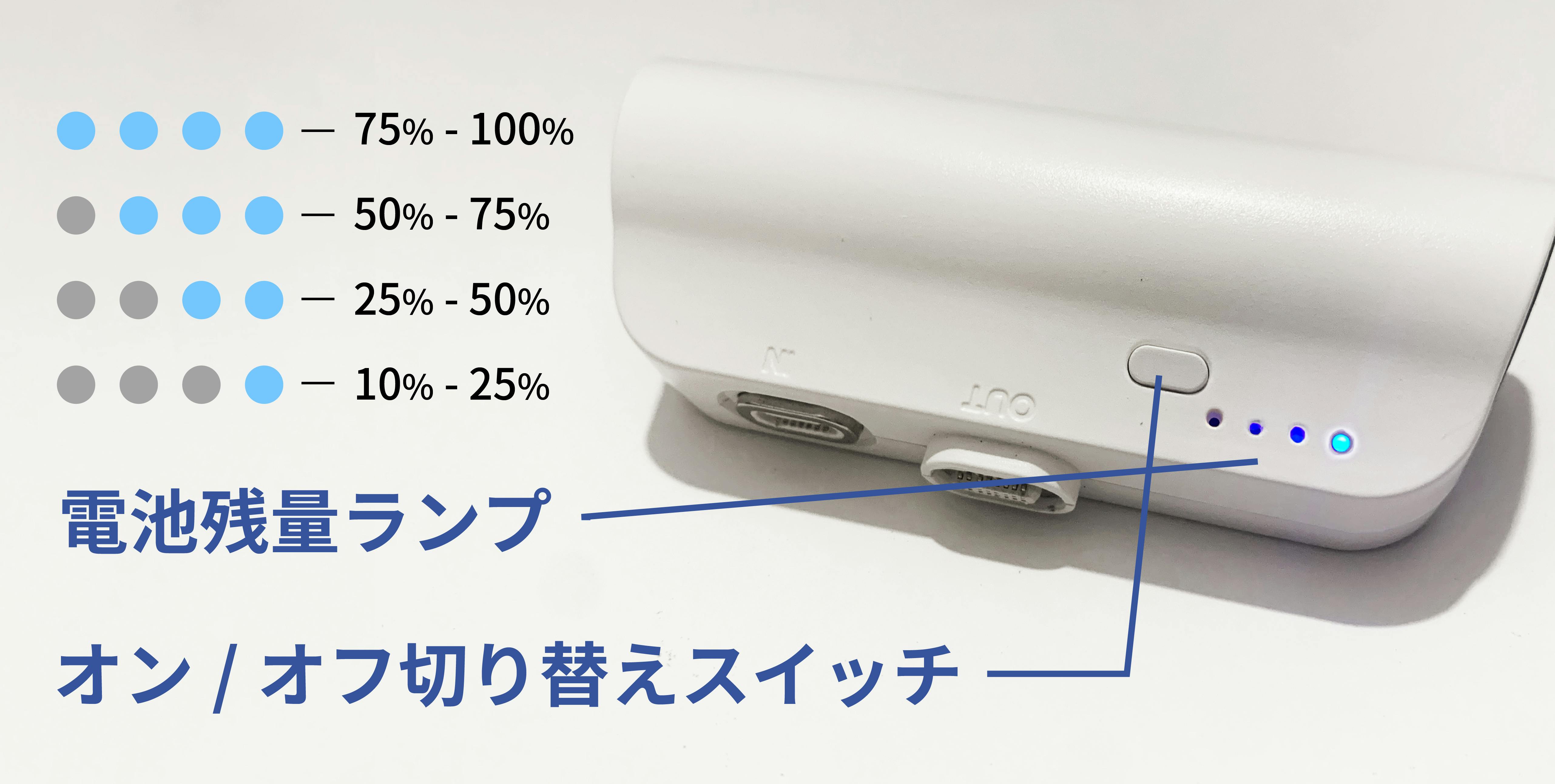 本体には、4段階の青色LEDと電源ボタンを搭載。電池残量も一目瞭然で充電忘れも防止します。