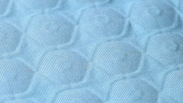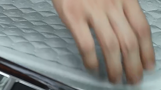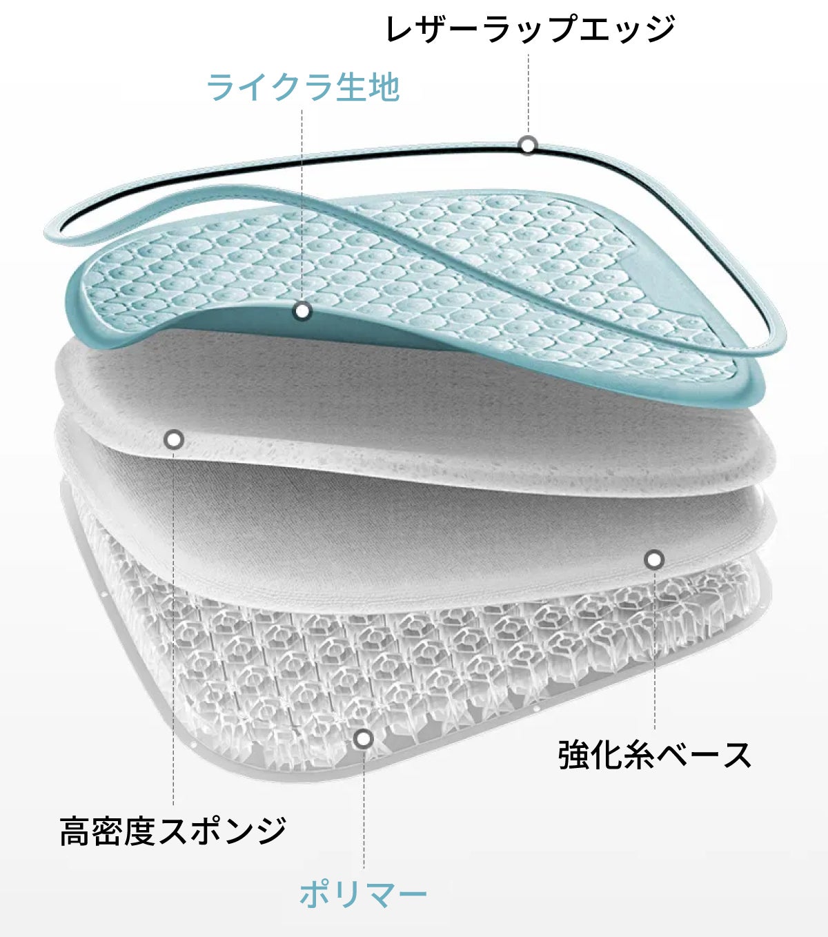 新世代のクッションで、カバーが要りません。布からポリマーまで統合して張り合わせた一体型です。この多重の素材構造が、夏を乗り切る快適さを生み出しています。