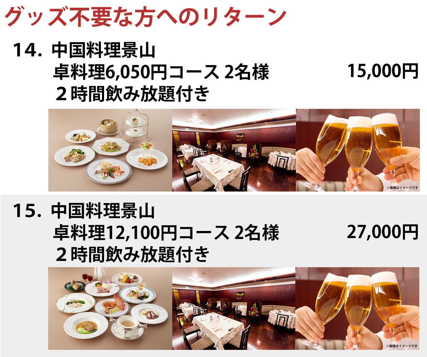 グッズ不要な方に、リターンへ「中国料理景山のコース+2時間飲み放題」を追加しました。ぜひご検討ください。