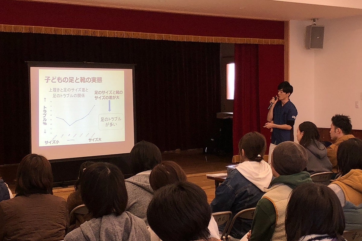 以前行った講演の様子また、今では少なくなったかもしれませんが、きょうだいの多い家庭で靴をお下がりにすることが昔はよくありました。お下がりの靴は前に履いていた子どもの癖がついた状態のため、足にはよくないのです。