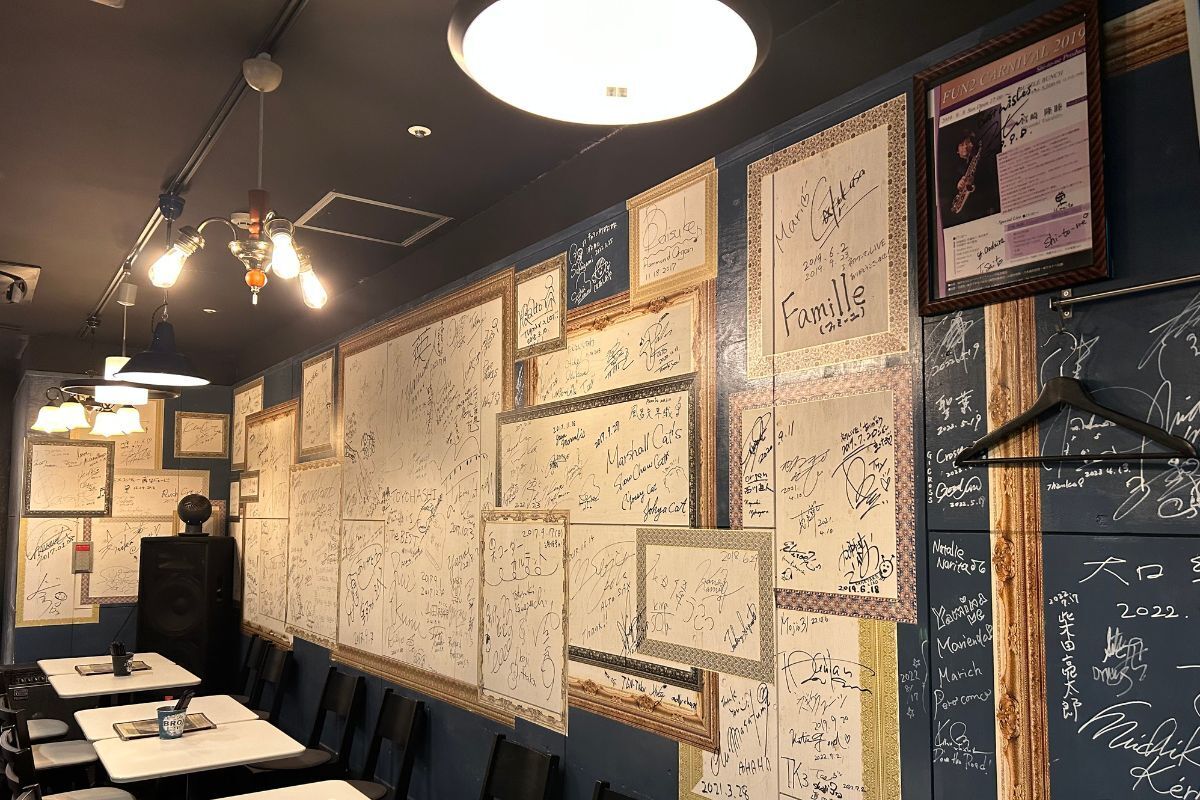 演者さんのサインでいっぱいになっている壁と、その思い出…