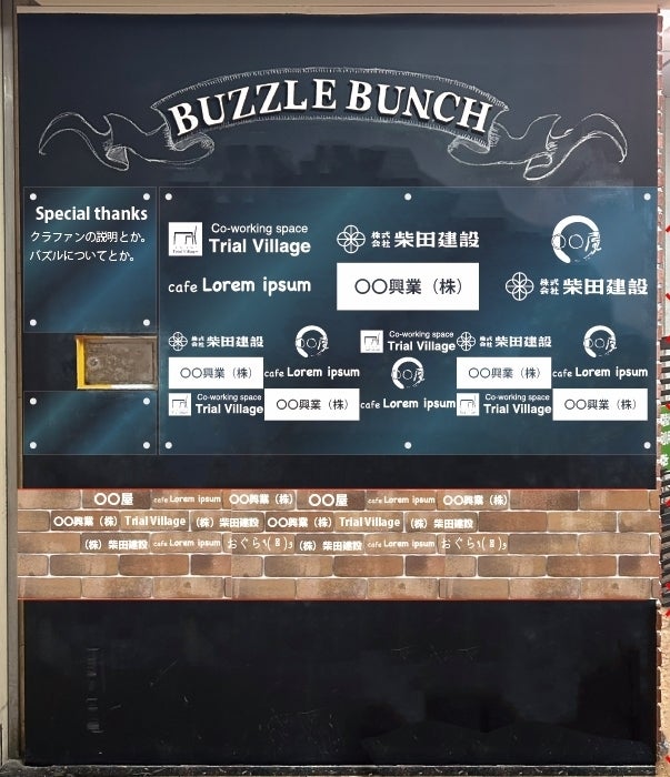 入り口すぐ横の黒板スペースにカッティングシートでお名前やロゴを掲載。掲載が完了しましたら活動報告のほかバズルバンチSNSなどでご報告させていただきます!
