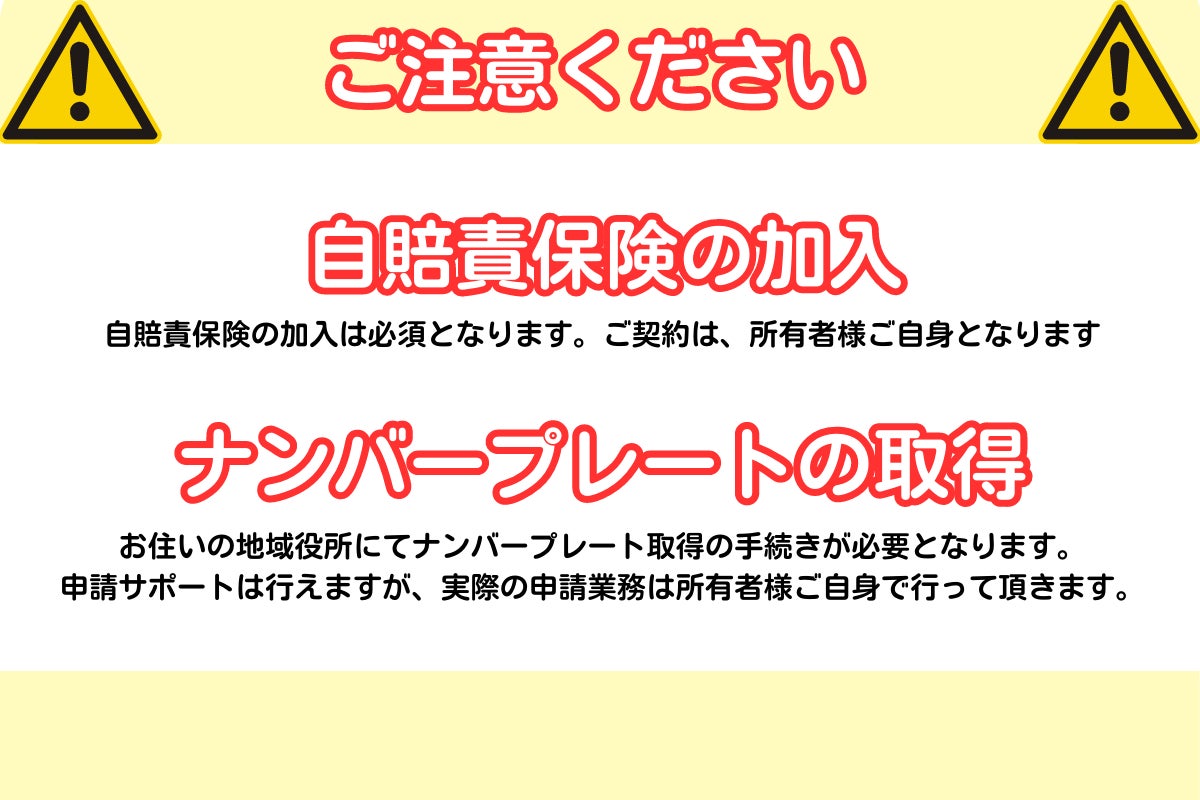 2.公道を走行する場合自賠責保険への加入が必須です。(加入せずに運転すると処罰の対象となります。)