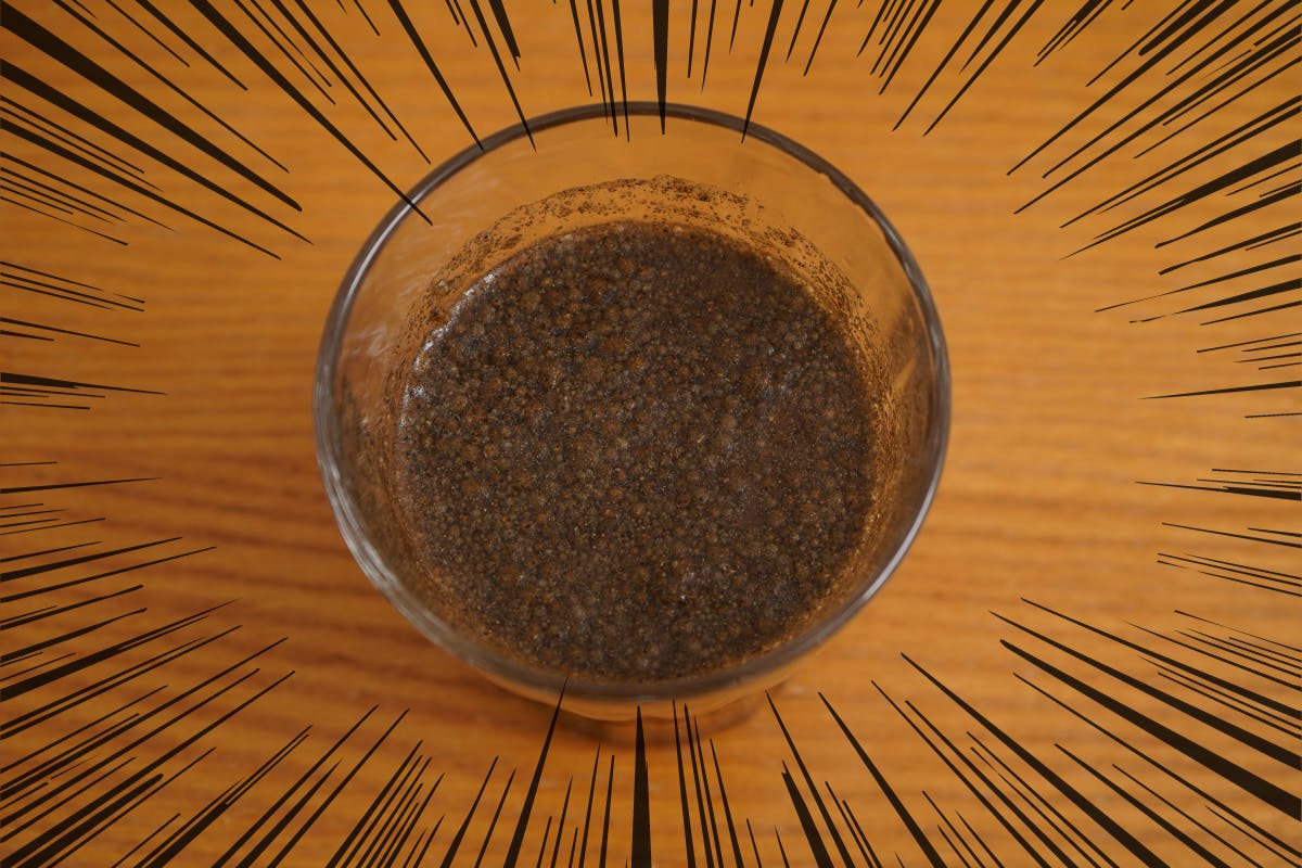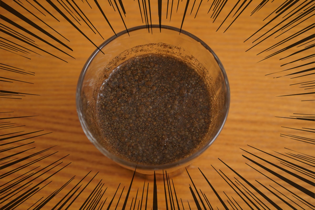 青汁というか・・・茶汁・・・?試作品の粉を水に溶かしたところ、とても溶けにくく浮遊物や沈殿物があり、見た目はお世辞にも良いとは言えません・・・