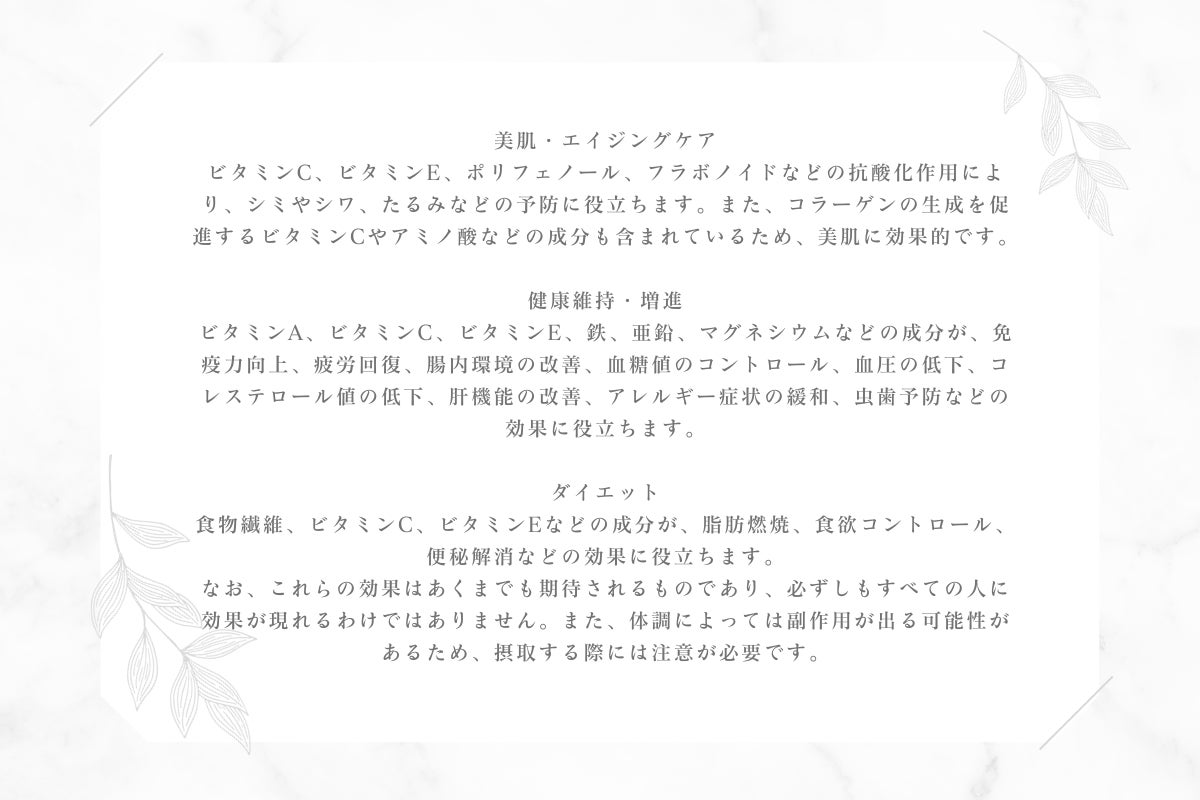 健康維持・促進 / 疲労回復 / 腸内環境の改善 / 血糖値のコントロール /血圧の低下 / コレステロール値の低下 / 肝機能の改善 / アレルギー症状の改善 / 脂肪燃焼 / 食欲コントロール / 便秘解消 等々、さまざまの効能が期待できます。