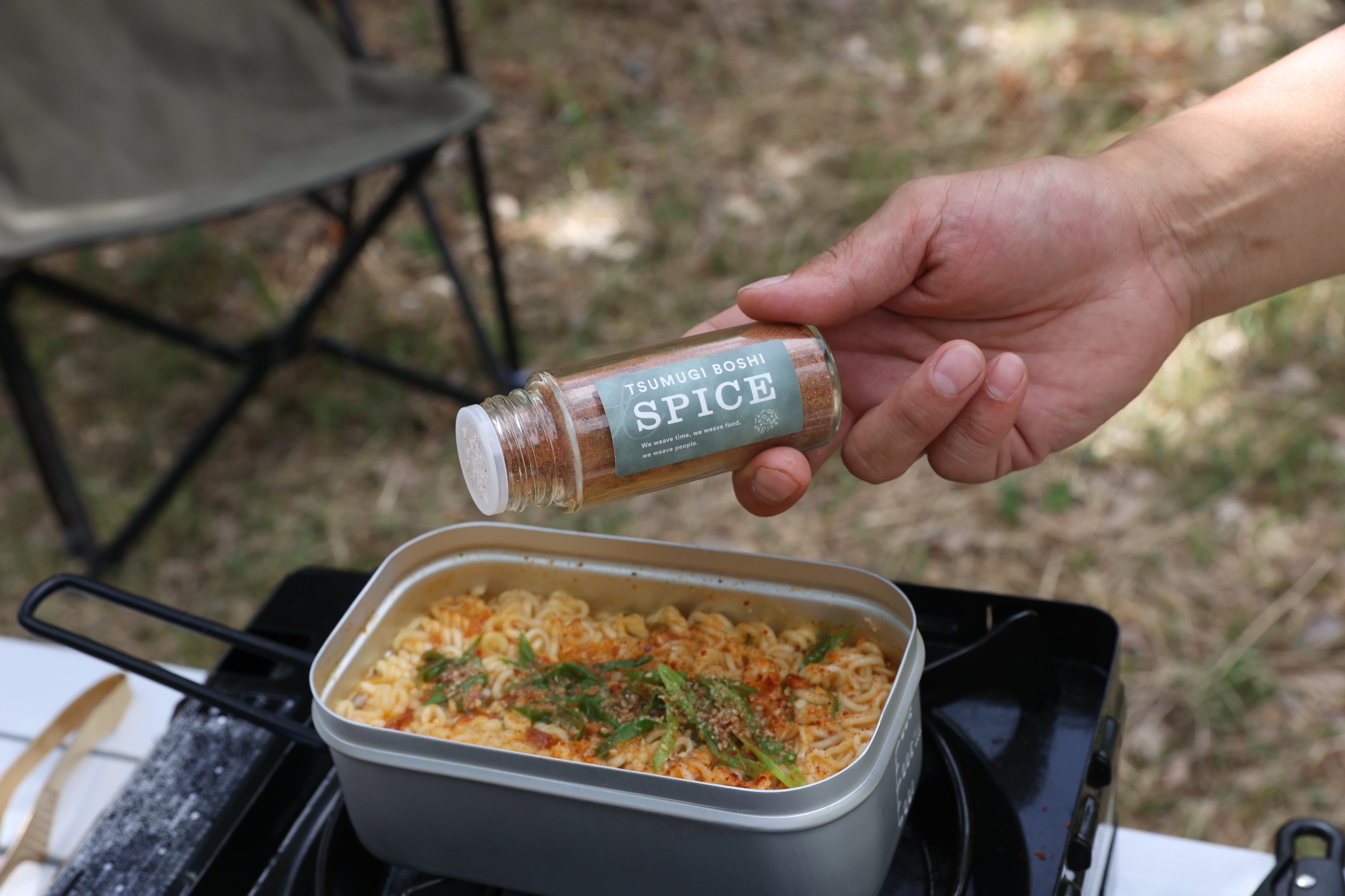 キャンプ飯ってがっつり作りたい時と小腹空いてちゃちゃっと済ませたいときありますよね。ツムギボシスパイスはどんなときでもお役に立てるアイテムです。