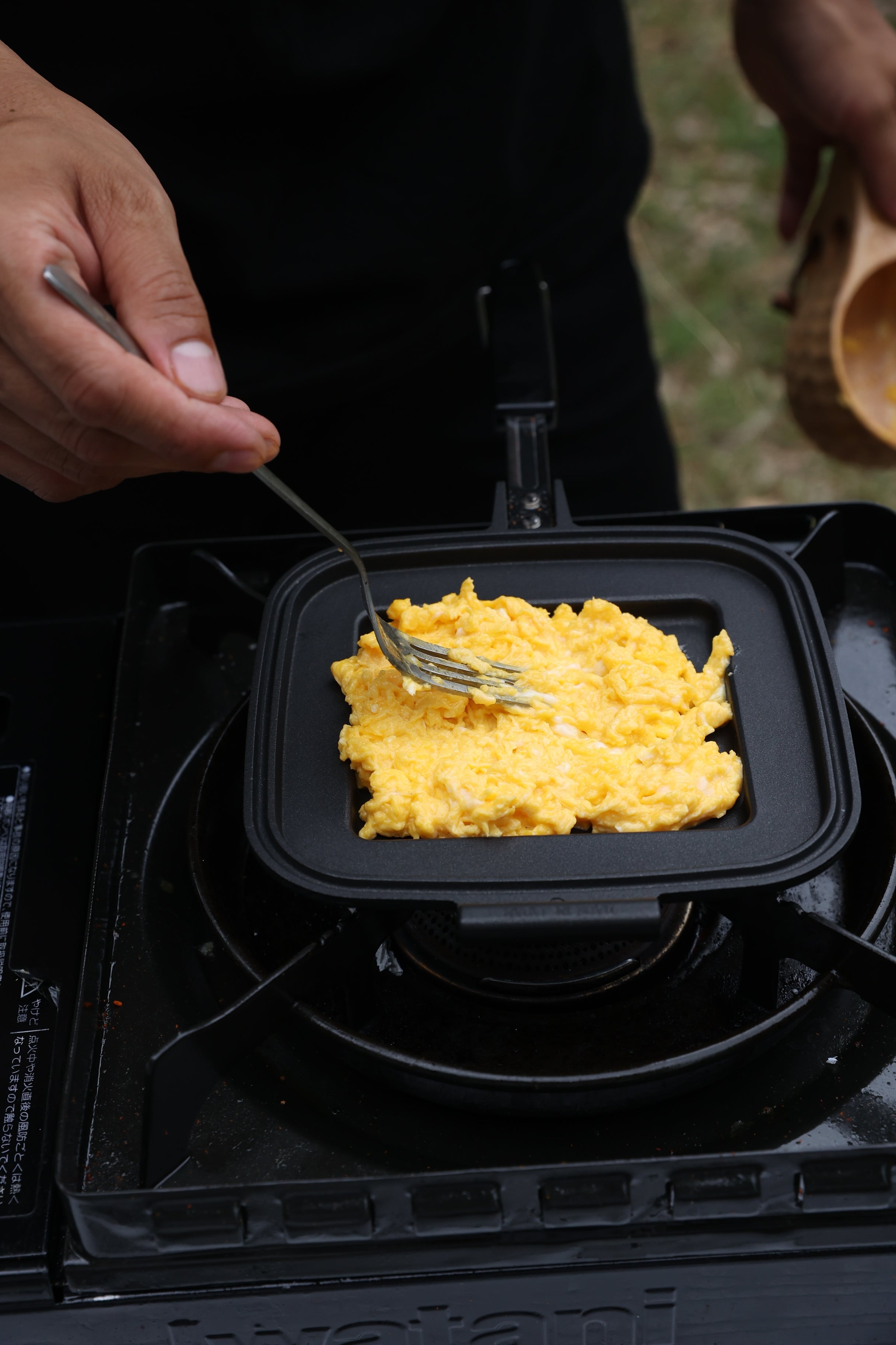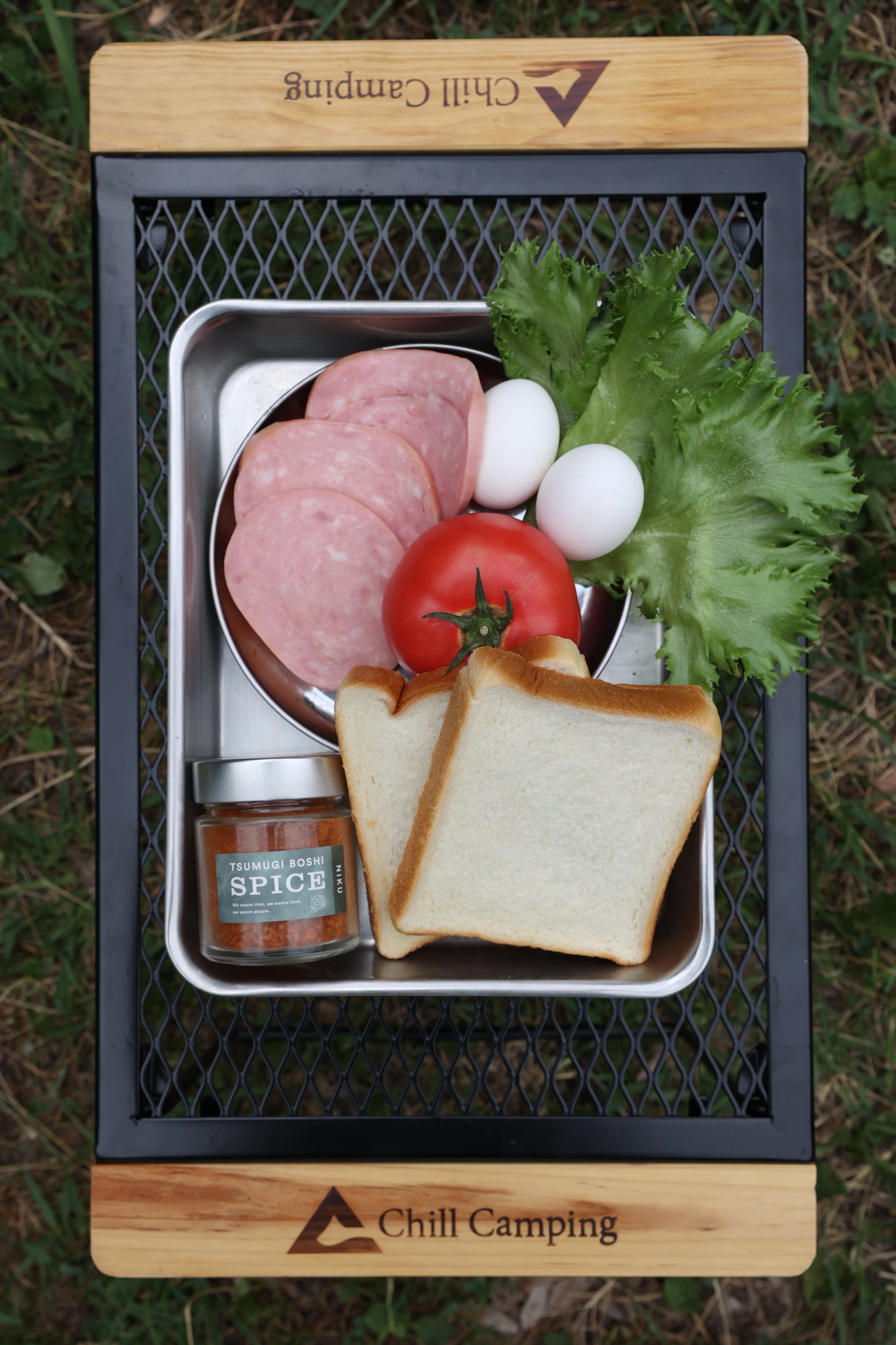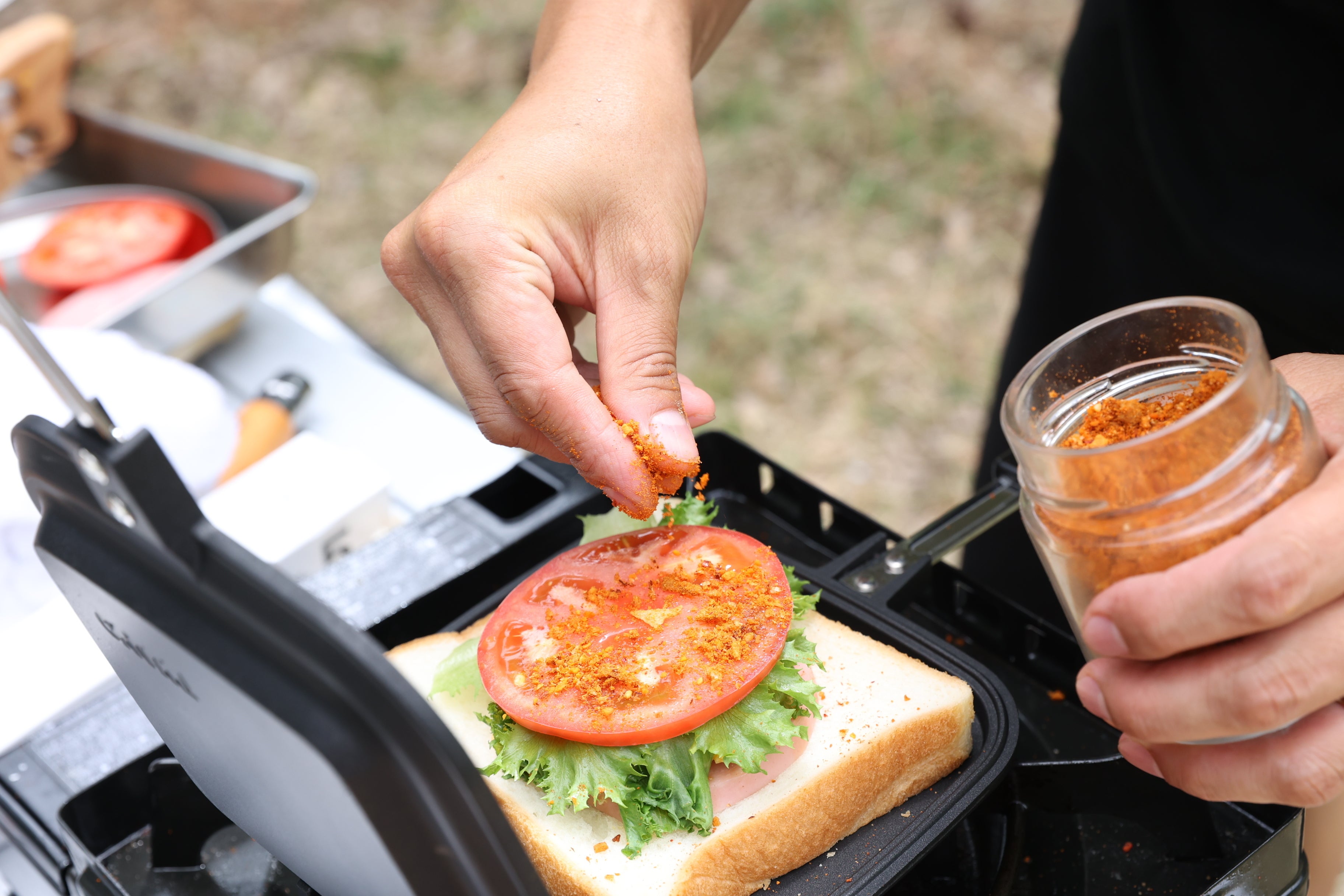 好きな食材を重ねてツムギボシスパイスNIKUをふりかけ挟んで焼きます