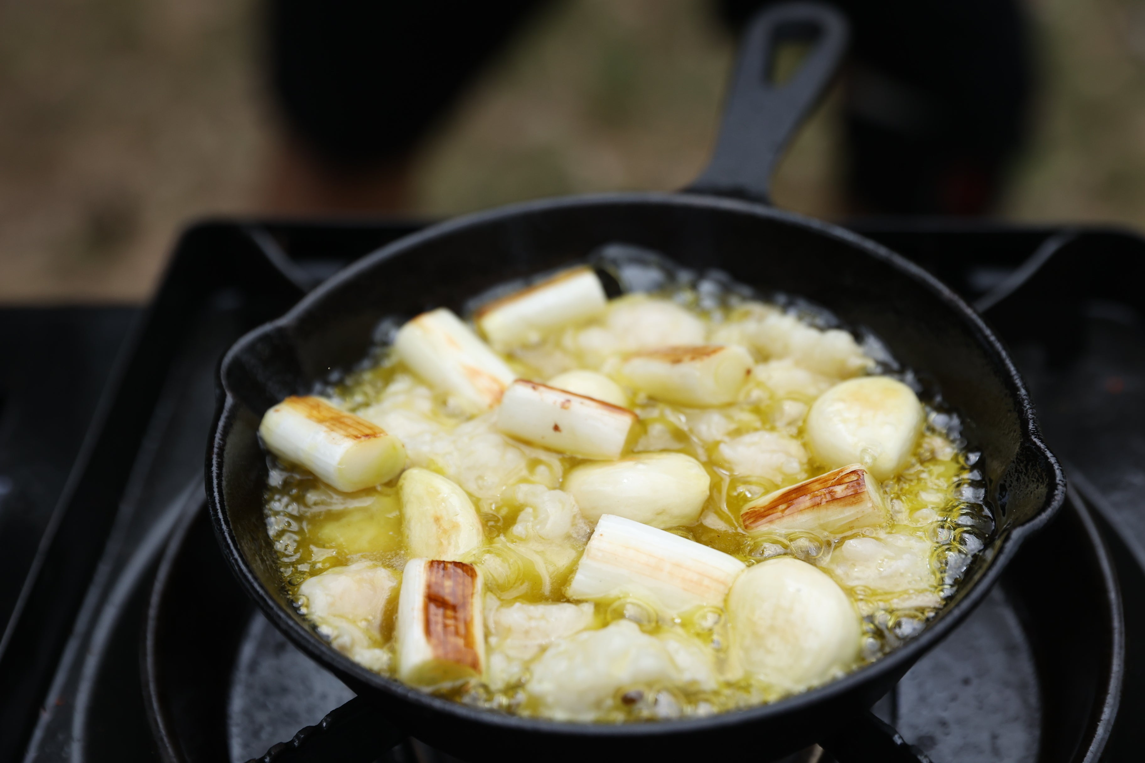 スキレットにまるごとニンニクと牛ホルモンを入れオリーブオイルをひたひたに注ぎます。(白ネギ入れるとさらに美味しい)
