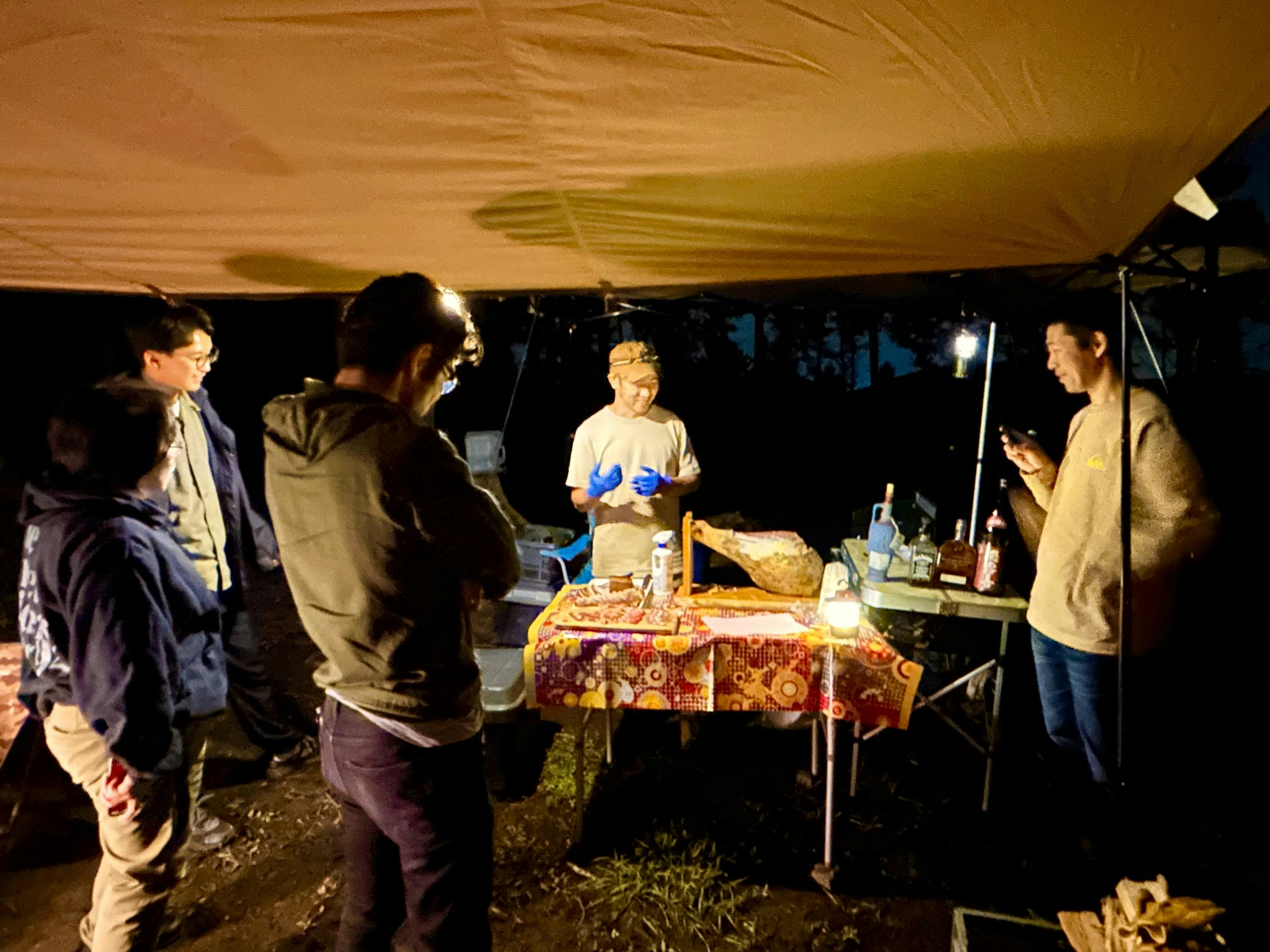 2024/11/11 17:5010月19日(26日)に、『「こぶたのしっぽ」キャンプ場熟成生ハム試食会+宿泊』のリターンを実施いたしました。限定3組様のプレミアムな体験会!!同じときがわ町にある超人気店・「手作りハムとパンの店・こぶたのしっぽ」のオーナーにお越しいただき、目の前で完成したばかりの生ハム※をスライスして貰い、まずはワインで乾杯!そして、未だ誰も知らない初めての味を、誰も泊まったことのない場内一の絶景サイト(新エリア・開拓中の区画)で食しました!もう絶品で美味しくて、美味しすぎて、文章では説明できません(笑他にも「こぶたのしっぽ」さんのサラミとコッパ、フランスパンに牛肉の赤ワイン煮、どれも最高でした!支援者の皆さんと「こぶたのしっぽ」のオーナーと一緒に焚き火を囲みながら、本当に楽しく素敵な時間を過ごさせていただきました。ご参加いただいた方、「こぶたのしっぽ」のオーナー、本当に有難うございました。※クラファンページにも記載しておりますが、当キャンプ場のどこかで「こぶたのしっぽ」さんの生ハムを熟成試験しており、1年半かけてようやく完成しました!生ハムは平均気温が低くて湿度がある場所が良いとのことで、光栄にもときがわ町で一番標高が高いエリアにある当キャンプ場を選んでいただきました。 もっと見る