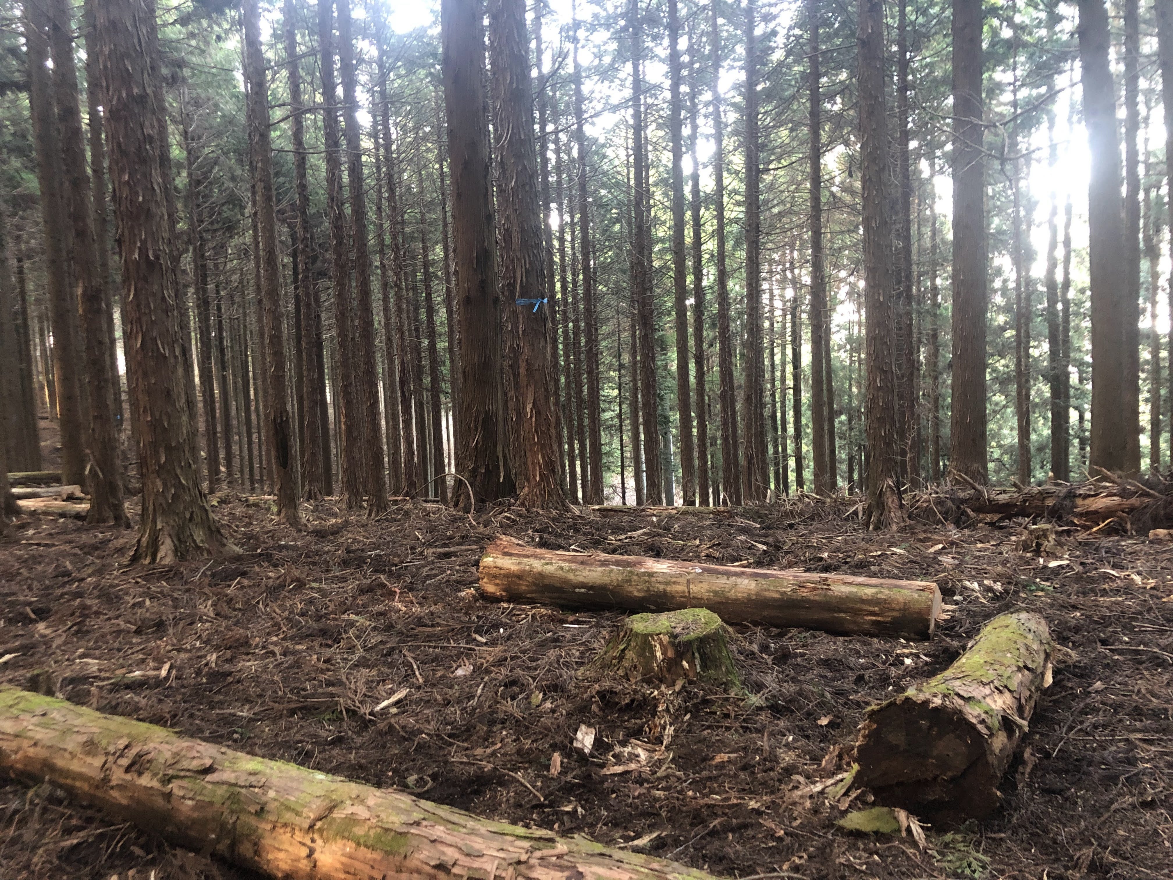 ちなみに、杉・桧だらけの鬱蒼とした山林でしたので、この時点では全く景色は見えませんでした。何度も地図ソフトでシュミレーションしたり、周辺を歩いてイメージをして、この写真の杉林の奥に絶景が見えるはずと確信しました!
