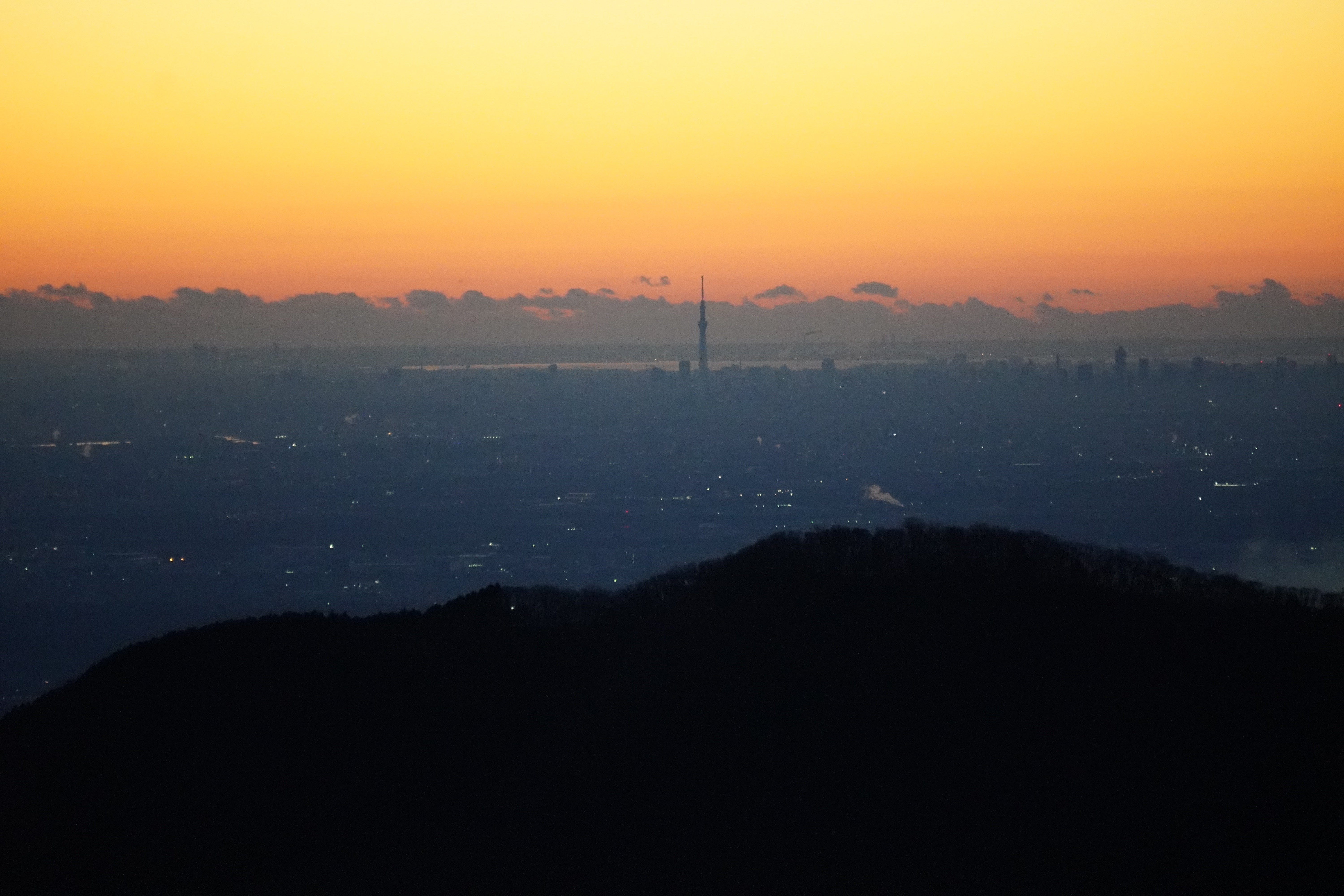 冬の空気の澄んだ寒い日限定になりますが、写真のように本当に薄っすらですがスカイツリーの奥側に東京湾が光って見えます。一部山の稜線で見えないところもありますが恐らく川崎沖まで。