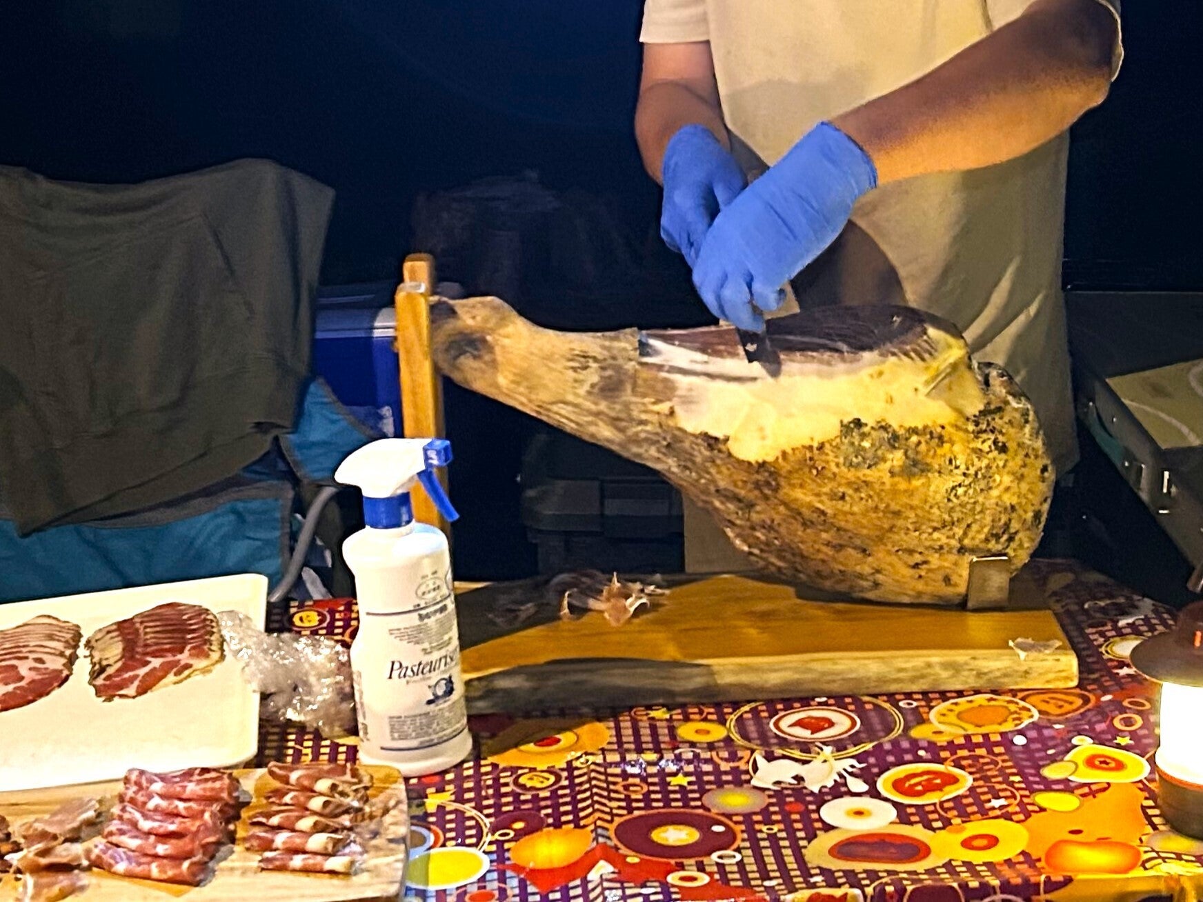 同じときがわ町にある超人気店・「手作りハムとパンの店・こぶたのしっぽ」のオーナーにお越しいただき、目の前で完成したばかりの生ハム※をスライスして貰い、まずはワインで乾杯!