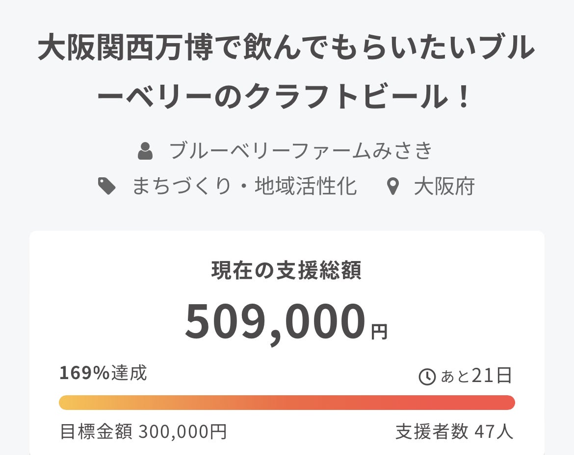 おかげさまで、2ndゴール達成しました。ブルーベリーのクラフトビールづくりを応援してくださっている皆様ありがとうございます!47名もの方にご支援をいただいています。本当にありがとうございます!2ndゴールでは、オリジナルラベルデザイン費、フライヤーなどの販促ツール作成費に利用させていただきます。次の3rdゴールは、加工用のブルーベリーの実を出荷するための選別作業の効率化、選果場設備の充実のための備品や設備の費用に利用させていただきます。 残り3週間で、最終ゴール達成のためプロジェクトのシェア等、支援者様のさらなるご協力をしていただけますと幸いです。こちらのリンクをシェアいただければと思います。https://camp-fire.jp/projects/view/681237よろしくお願いします。 ====================10/31まで!!クラウドファンディングで広く支援者を募っています====================なんでビールづくりを始めたのか? ビールづくりでどんなことを目指しているのか? などを、ブルーベリー農園に来ていただいたお客様にもお伝えし、たくさんの方々に応援して頂きたいとの想いから、寄付型のクラウドファンディングを立ち上げています。クラウドファンディングでは、ブルーベリー関連のさまざまなリターン(返礼品)を用意しています。現時点での人気のリターンは出来上がったクラフトビールの詰め合わせです。その他、ブルーベリー狩りの入園チケット、ブルーベリーの宅配、ブルーベリーの樹の年間オーナー制度権、ブルーベリーの栽培キットなど、ブルーベリー関連のリターンが多数ございます。寄付金の1stゴールは早々に達成しましたが、最終ゴールはまだまだですのでご支援いただければ幸いです。くわしくはこちらのサイトでご案内しています。https://camp-fire.jp/projects/view/681237どうぞよろしくお願いします。●=●-●=●-●=●-●ブルーベリーファームみさき●=●-●=●-●=●-●●ホームページhttps://blueberry-misaki.osaka●ブログhttps://ameblo.jp/blueberryhannan/●インスタグラムhttps://www.instagram.com/blueberryfarmmisaki/●フェイスブックhttps://www.facebook.com/blueberryfarmmisaki/●X(旧ツイッター)https://twitter.com/0Rm84uMWokOg2hg●スレッズhttps://www.threads.net/@blueberryfarmmisaki●=●-●=●-●=●-●