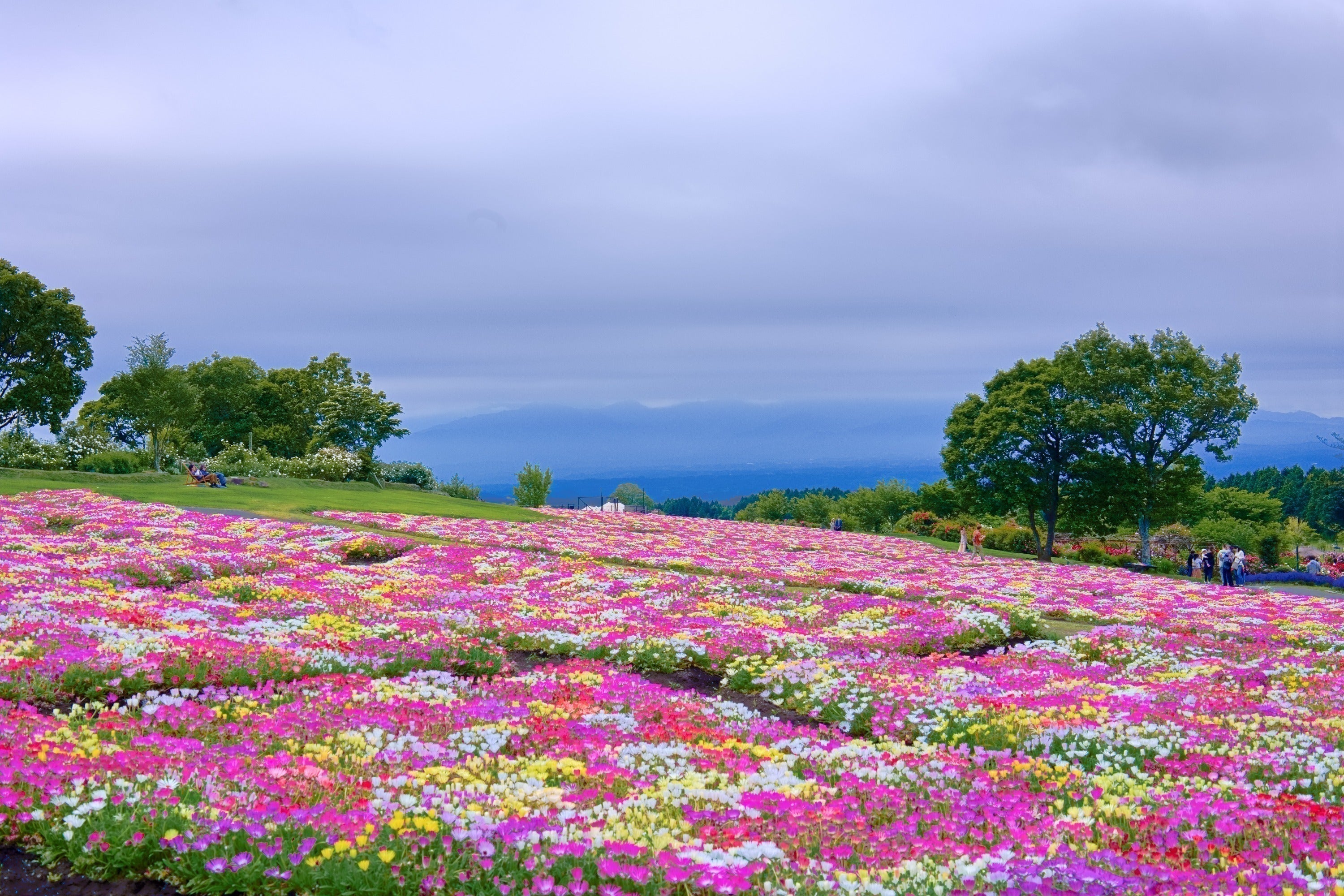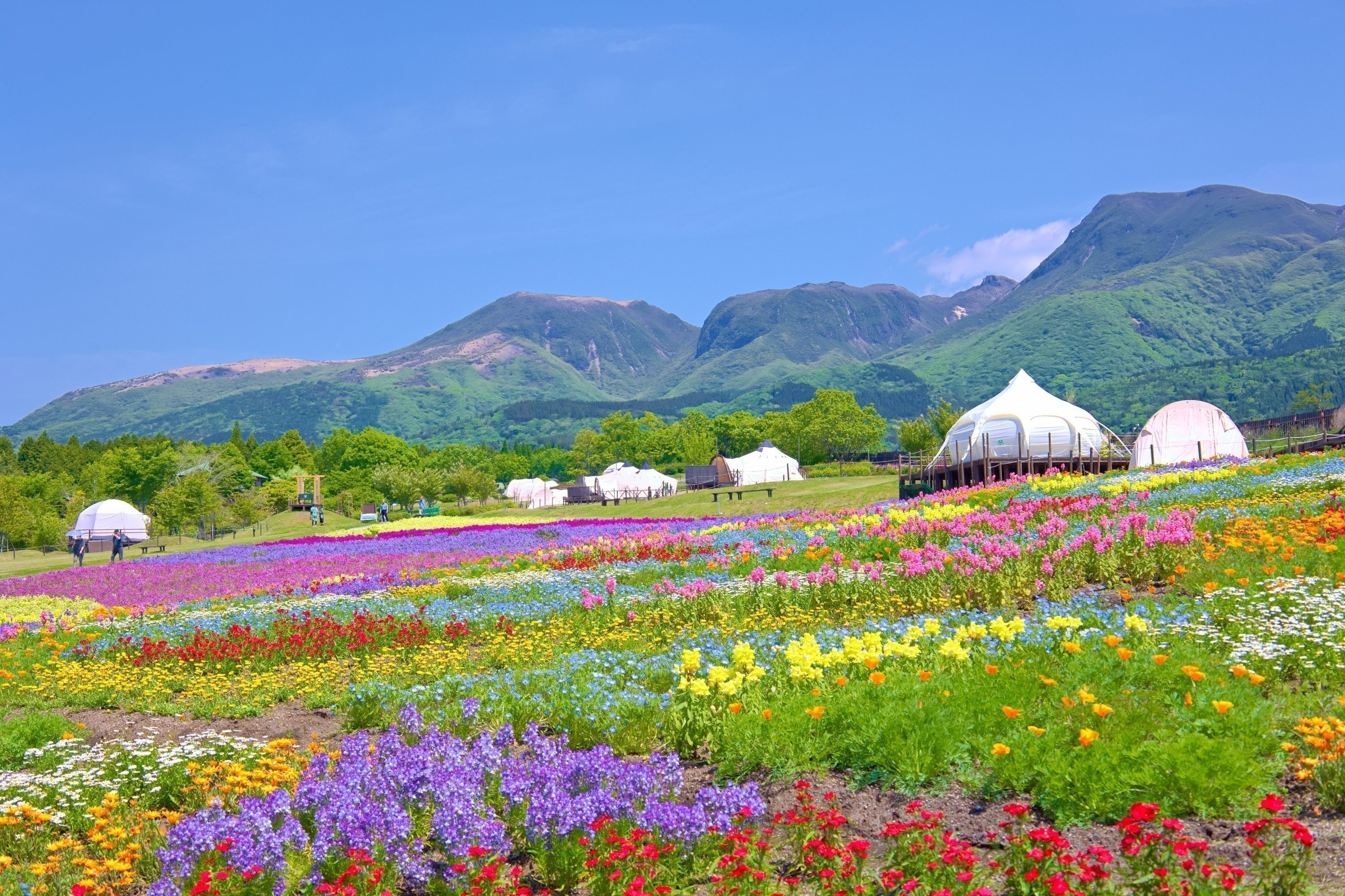 大分県竹田市にあるくじゅう花公園は阿蘇国立公園内の久住高原に位置し、日本百名山のくじゅう連山や遠くに阿蘇五岳を背景とした美しい自然が満喫できる花公園です。
