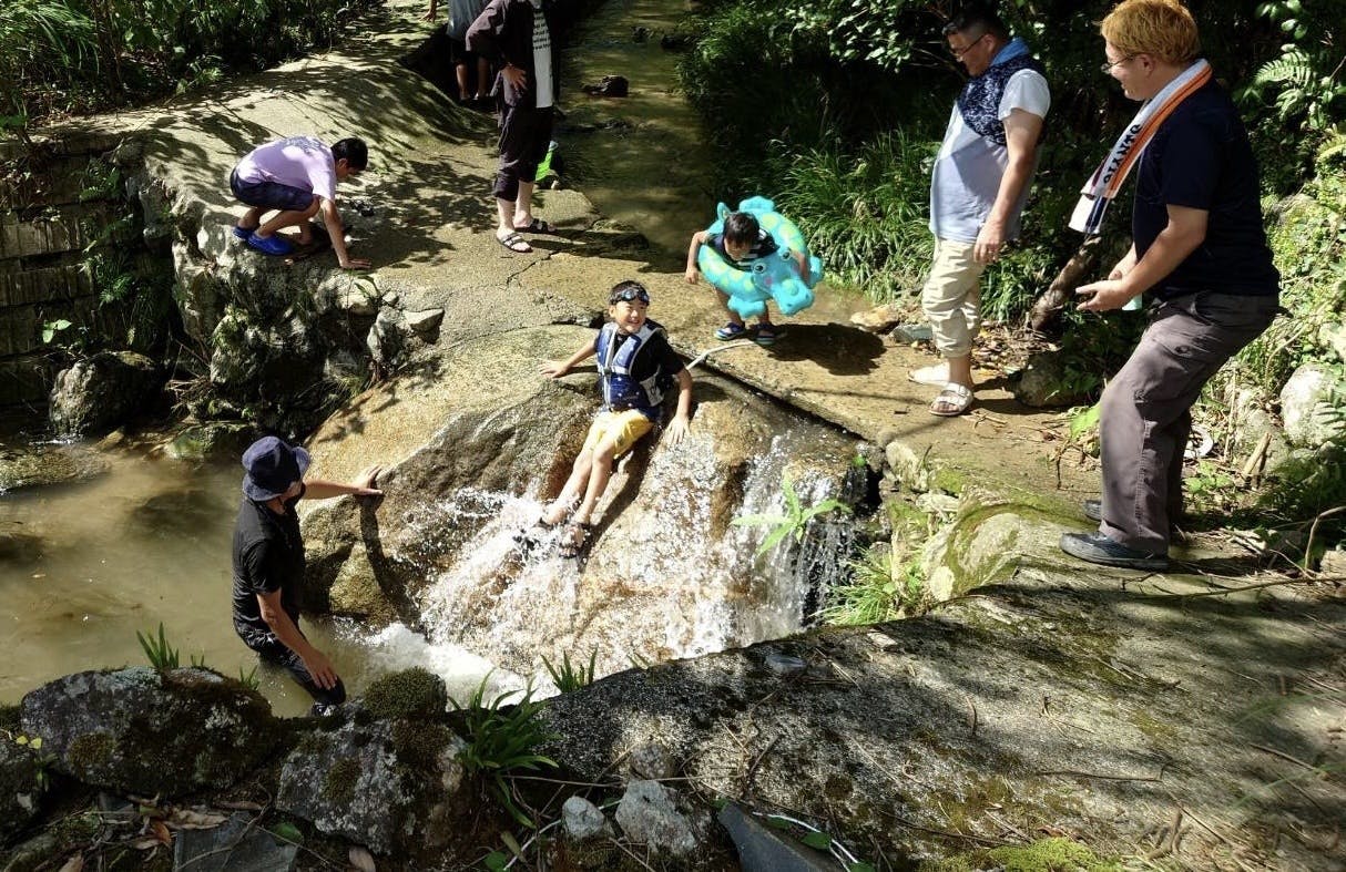 様々な昆虫やサワガニそして小魚に触れたり、鳥達のさえずりを聴いたり、花や植物を眺めたり香りを楽しむ、10年放置されたからこその生物の多さを体感し、敷地内に有るからこそのプライベートな空間で沢遊び等が楽しめる場所を造ります。