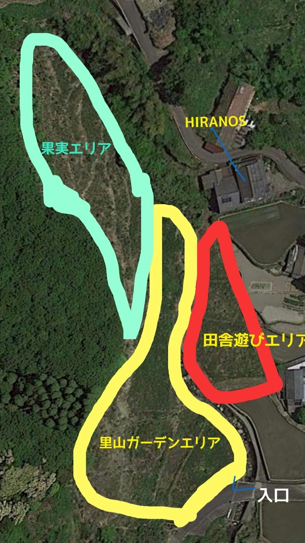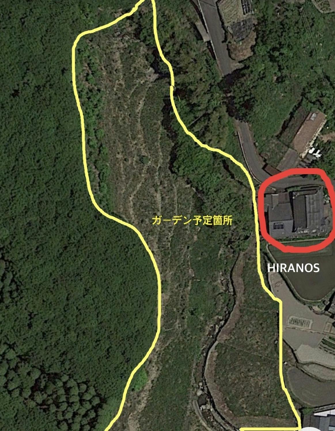 里山集落をイメージしたガーデンだからこそ、畑や果実、炭焼小屋等色々な可能性を生み出すことができるのがこの場所の魅力です。(画像はまだ人が生活をされていたころのHIRANOSとその周囲です、この道が唯一の入口になります)