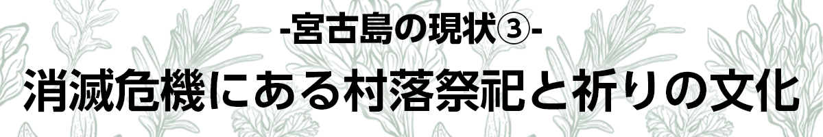 つまり、森林面積の減少、宮古島の都市化・リゾート開発の影響もあり、受け継がれてきた村落祭祀も衰退化、消滅危機にあります。