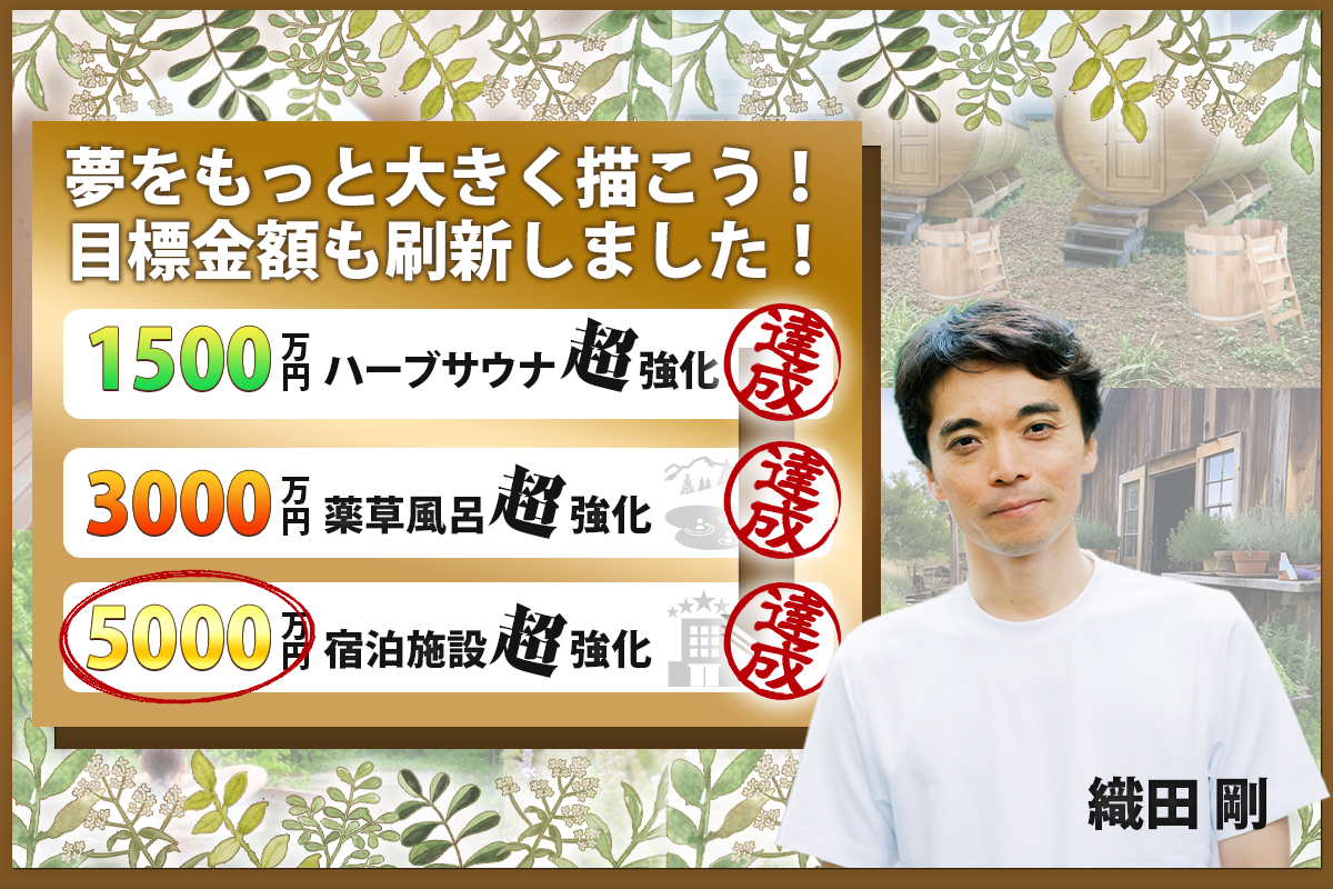 皆様の心温まるご支援の力で、当初思いもよらなかった「5,000万円」が集まり、「ハーブサウナ」、「薬草風呂」、「宿泊施設」を超強化した上で、夢の宮古島薬草リトリート施設の着工がスタートできます!