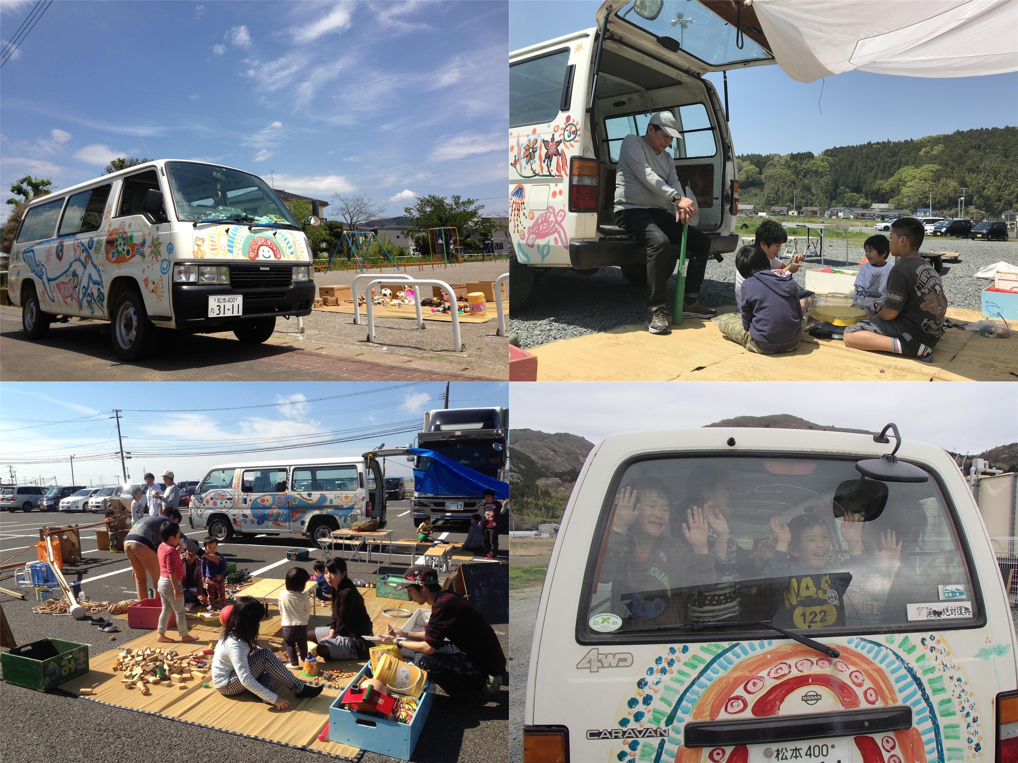 くじら号は、津波により多くを流されたまちの中を、遊び道具を載せて市内の子どものもとへ飛び回ってくれました。 車体に描かれた絵は「被災地の人に元気になってほしい」という願いを込めて、みんなで描きました。