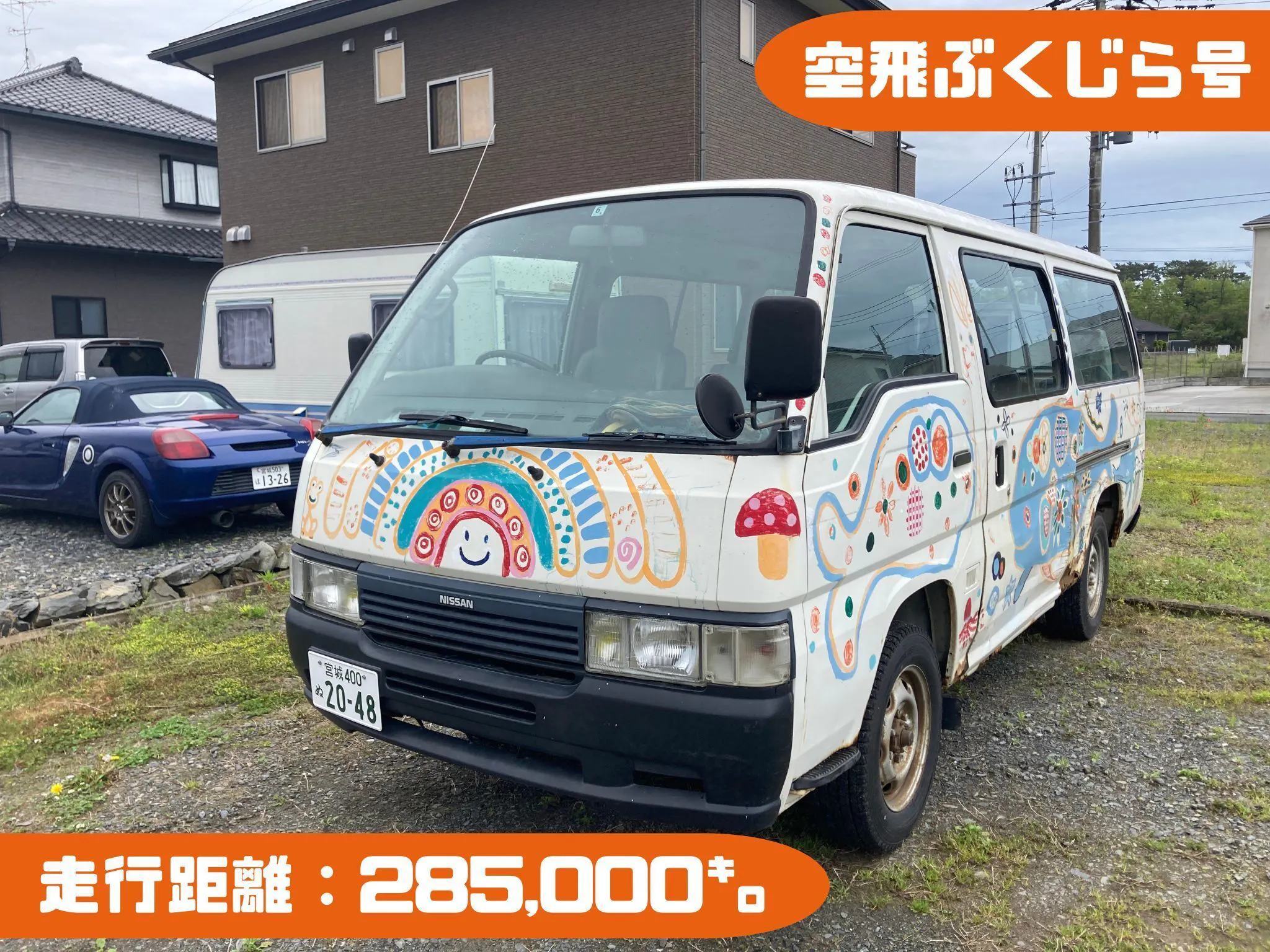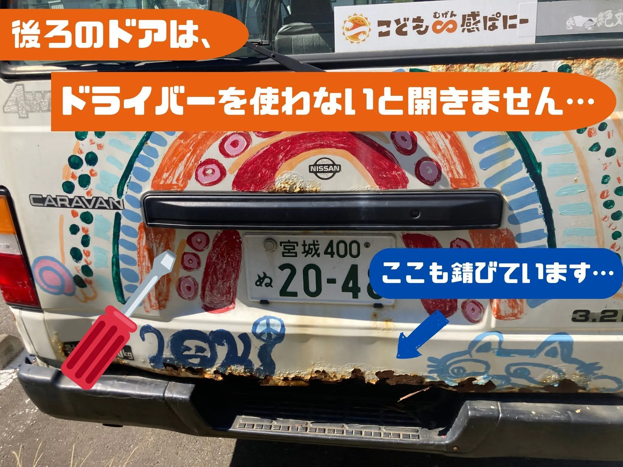 東日本大震災の年に、走行距離96000㎞でやってきた“空飛ぶくじら号”は現在285,000㎞を走りぬき、とうとう引退の時がきました。車体のあちらこちらに傷みがでて、子どもを乗せて出かけることができなくなりました。