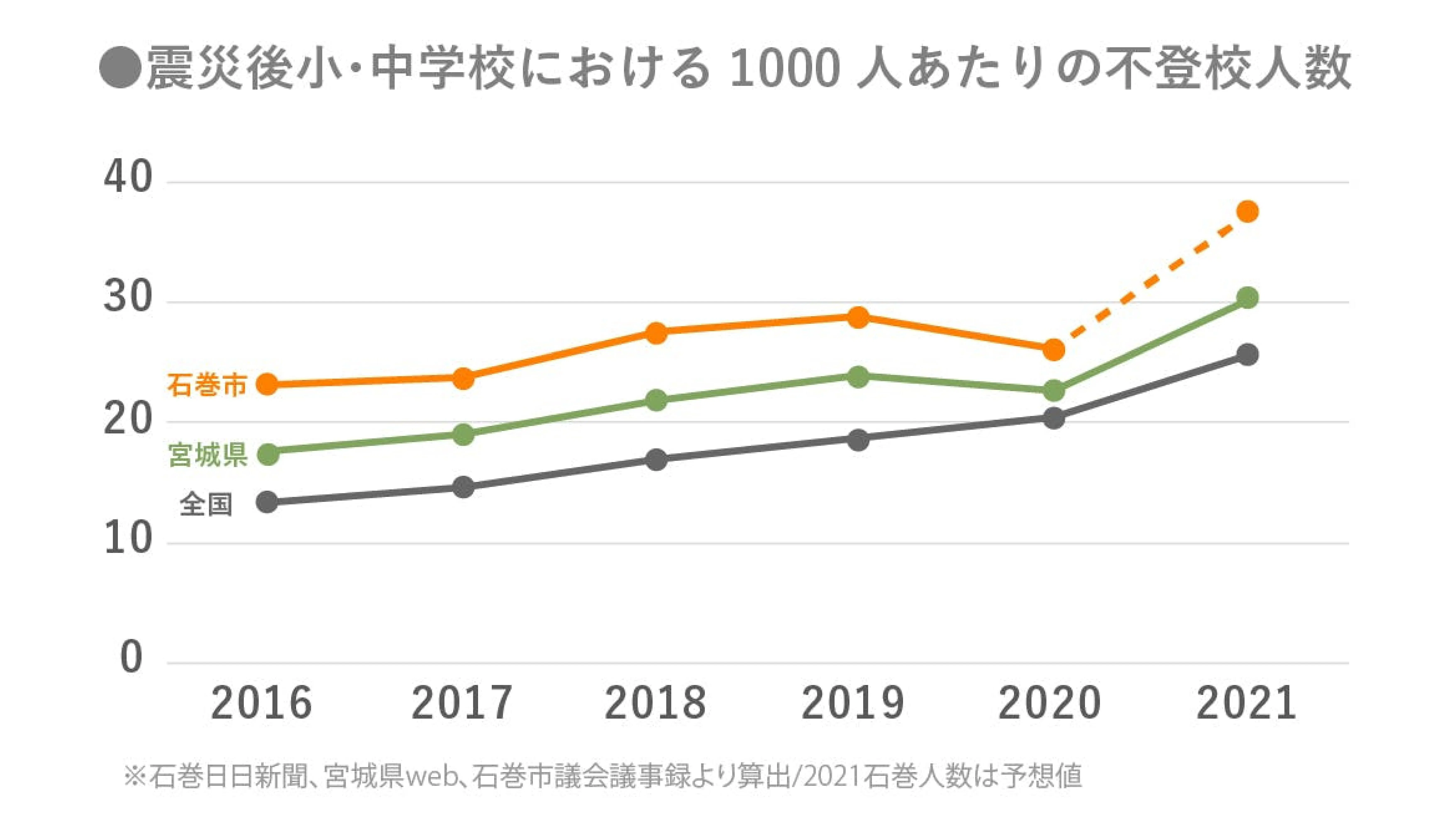 石巻市は毎年、全国と宮城県の不登校率を大きく上回っています。